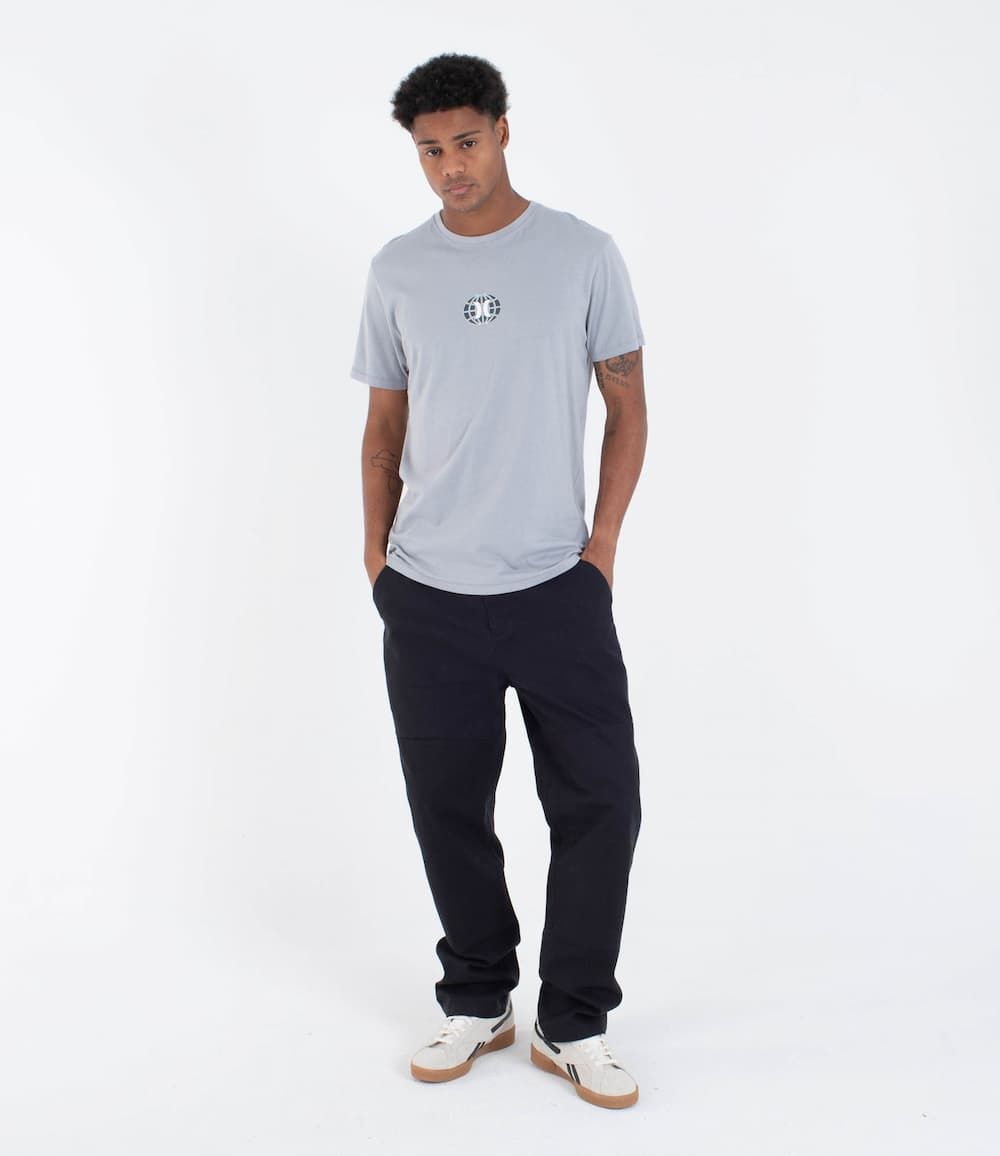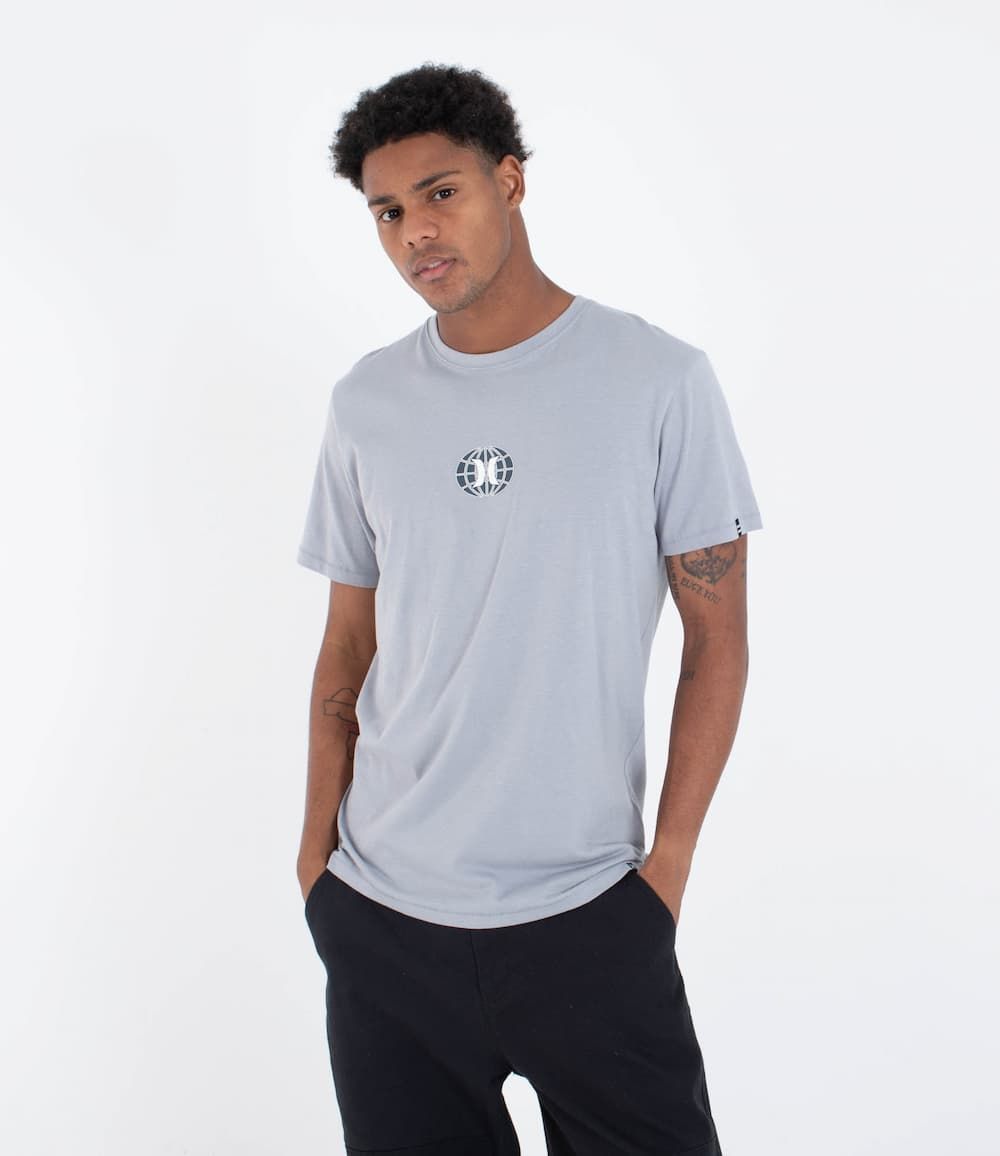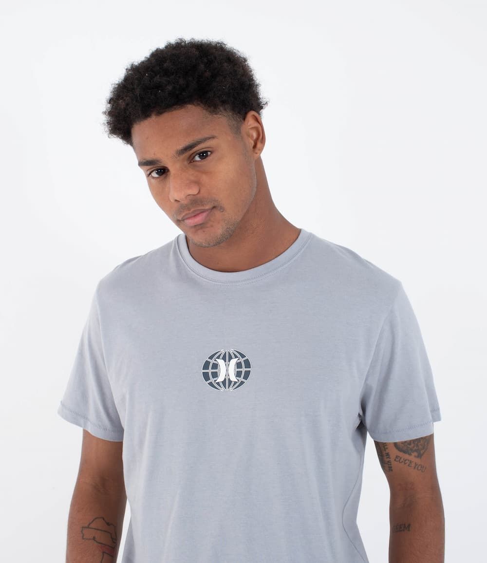 El diseño incluye un logo tipo globo terráqueo con el icónico símbolo de Hurley estampado en el pecho y una composición gráfica en la espalda con múltiples referencias visuales a la identidad “international” de Hurley. Estos elementos visuales aportan una estética retro con carácter, inspirada en la escena underground del skate y el grunge de principios de los 2000.