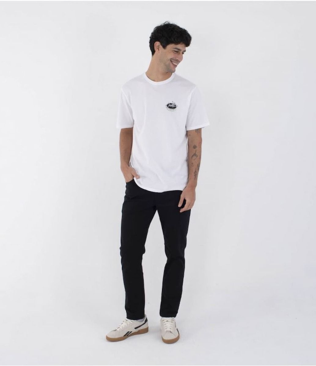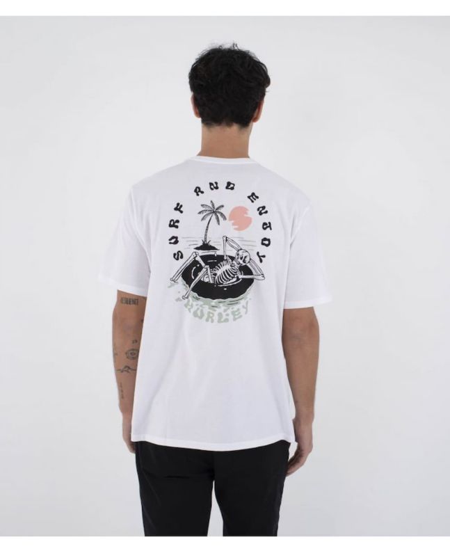 Camiseta blanca de algodón de peso medio con ajuste regular, gráfico en la espalda y mensaje “Surf and Enjoy”. Comodidad, rollo y actitud Hurley.