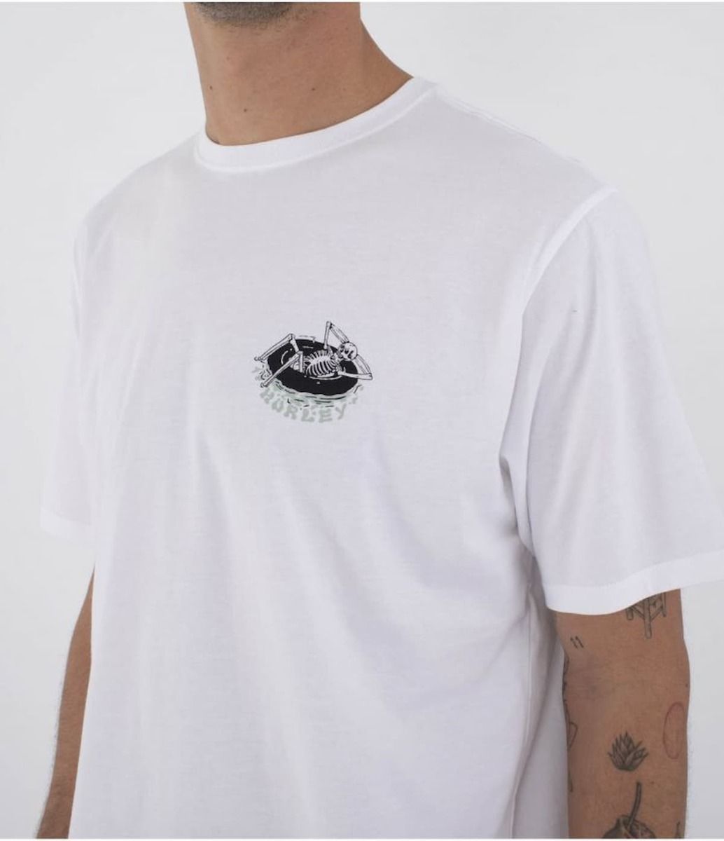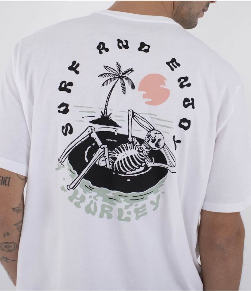 Surf and Enjoy. Así, sin más. Esa es la actitud que transmite la camiseta Floatin de Hurley: un diseño fresco y despreocupado que celebra el lado más relajado del surf. Con un esqueleto tomando el sol sobre un flotador, esta camiseta blanca no es solo una prenda, es una declaración de intenciones.