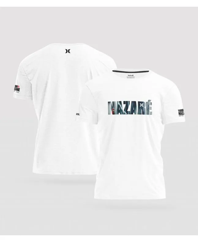 La camiseta orgánica Nazaré blanca cuenta con ajuste regular, cuello redondo, manga corta, el logo de Nazaré y Hurley junto con un gráfico del evento diseñado por el artista local Johny Vieira estampados en el pecho, impresión WSL en la manga derecha, impresión Tudor Nazaré Tow Surfing Challege x Hurley en la manga izquierda y el logotipo de Hurley estampado en la parte posterior del cuello.