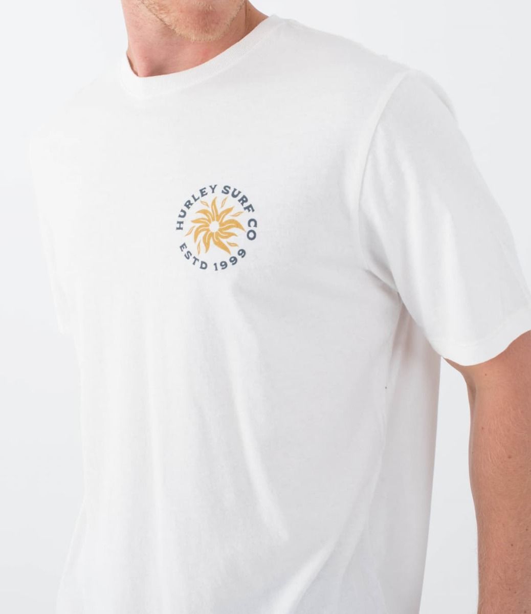Confeccionada en 100% algodón, la camiseta de manga corta Youcan Tucan Barely Bone te garantiza frescura y suavidad. Su diseño presenta cuello redondo y un detalle serigrafiado de "Hurley Surf Co ESTD 1999" en el lado izquierdo del pecho. En la parte posterior, destaca un llamativo estampado de un tucán, una palmera y el sol, inspirado en la esencia del surf y la naturaleza.