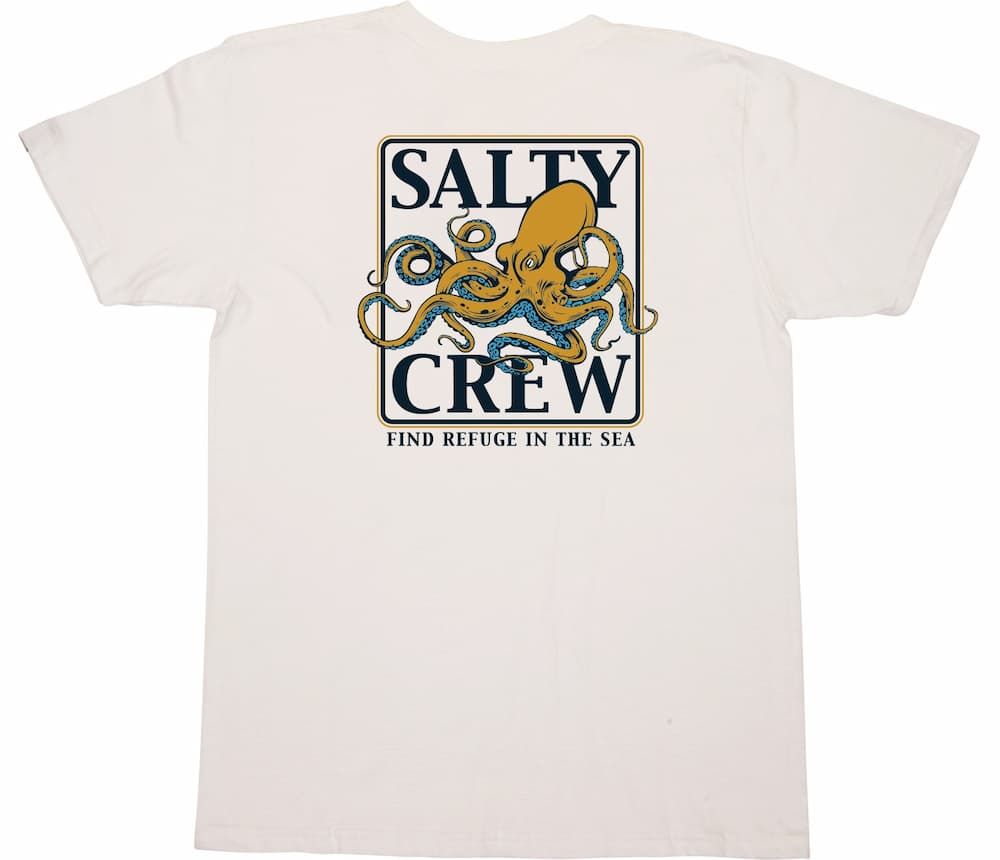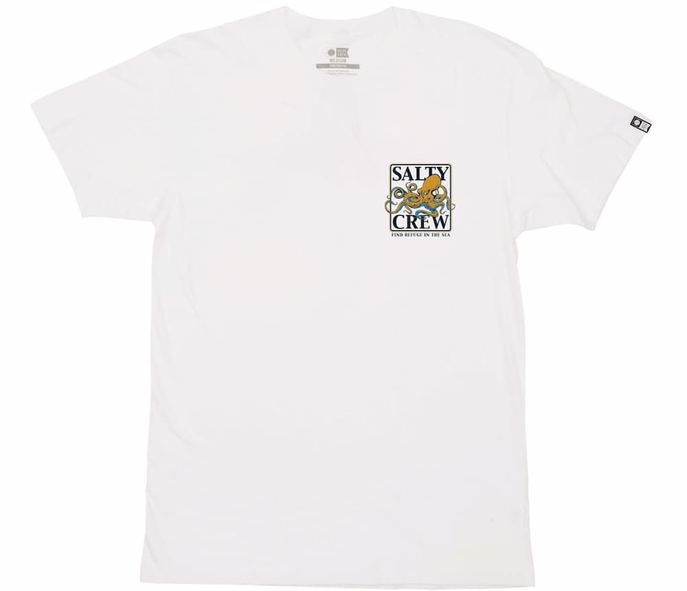 Esta camiseta de corte clásico cuenta con cuello redondo, manga corta y estampado original Salty Crew de un pulpo junto con la leyenda "Find refuge in the sea" (Encuentra refugio en el mar) impresos en el lado izquierdo del pecho y en la espalda.