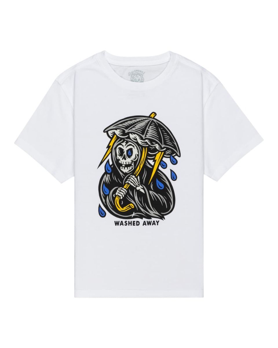 Esta camiseta sostenible de corte clásico, perteneciente a la Colección Washed Away de Timber! y Element Brand, cuenta con cuello redondo, manga corta, punto canalé en mangas y dobladillo inferior, junto con un gráfico exclusivo de un esqueleto con paraguas obra del artista Chad Eaton (AKA Timber!) serigrafiado en la parte delantera.