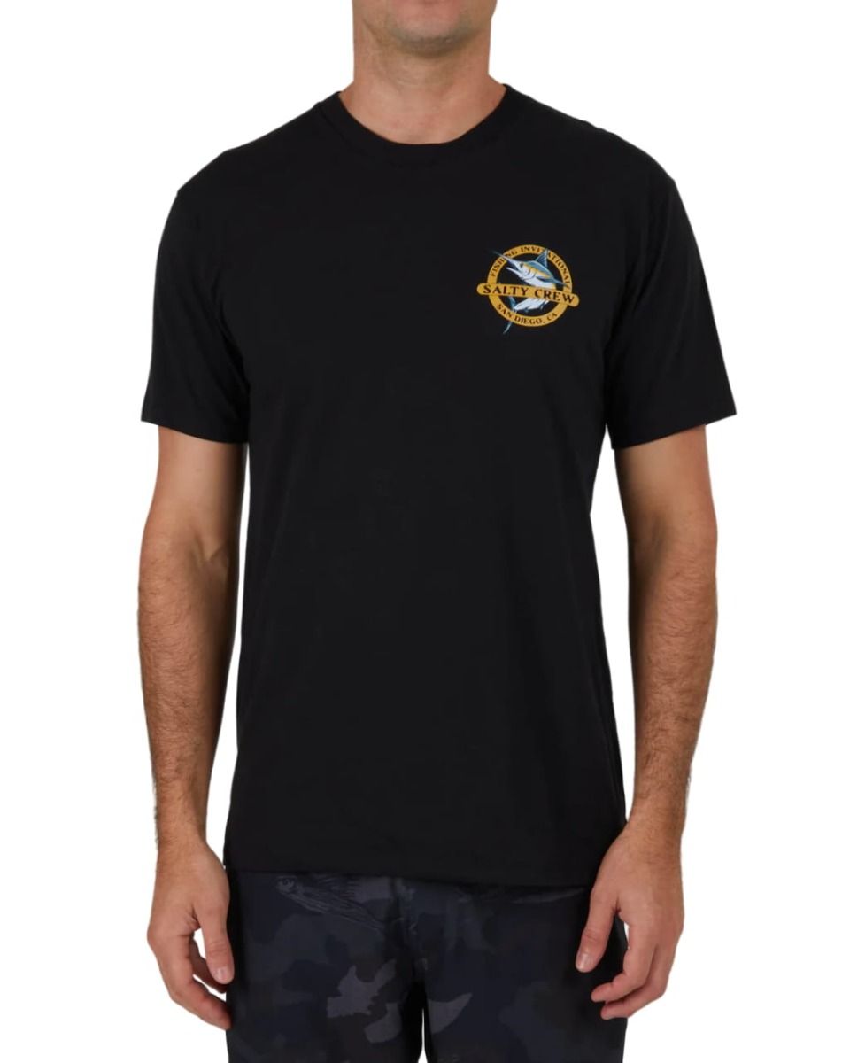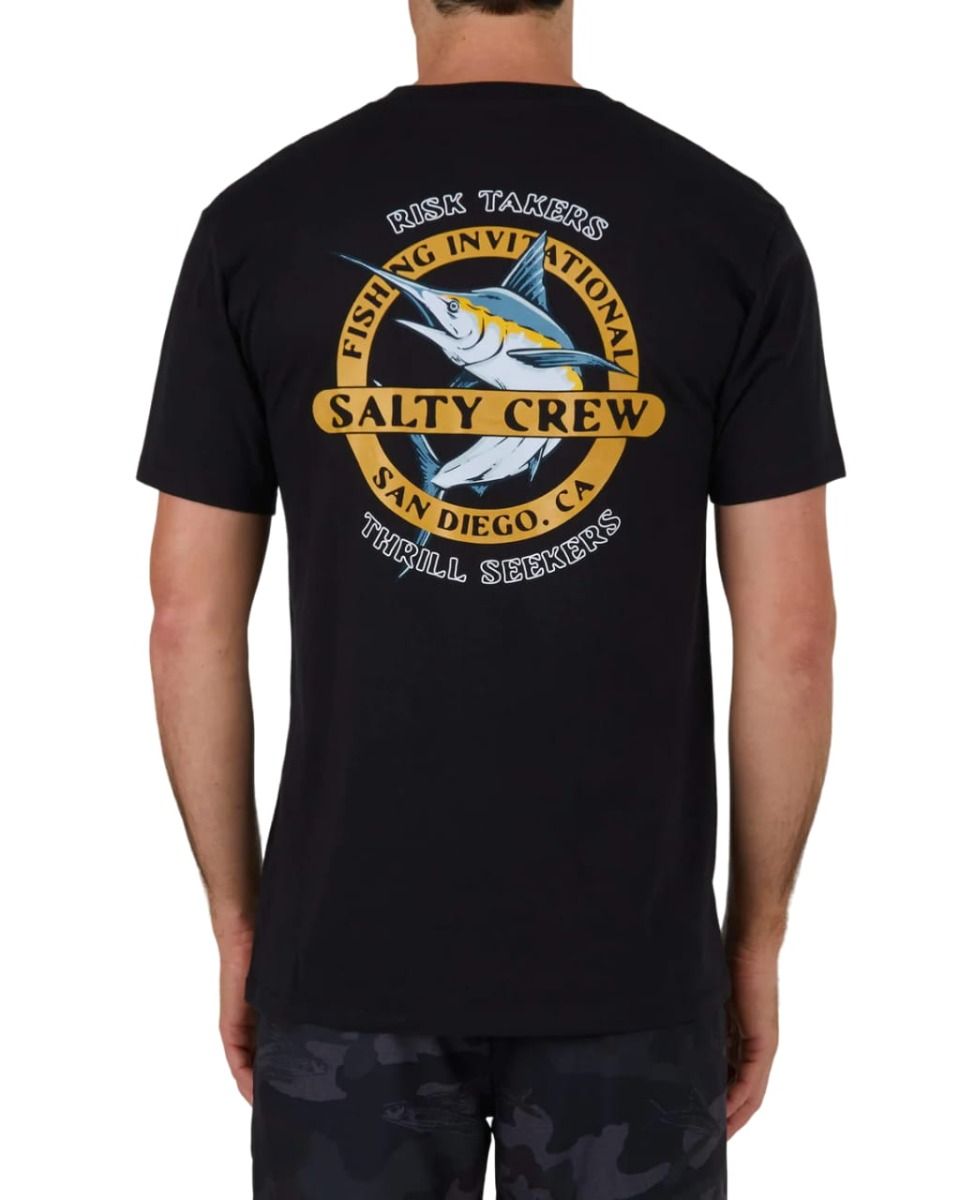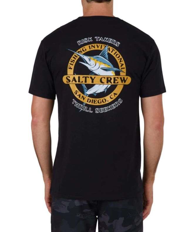 Esta camiseta negra inspirada en la pesca viene con cuello redondo, manga corta, estampado original Salty Crew de un pez espada junto con la inscripción "Thrill Seekers and Risk Takers" (Los que buscan emociones y se arriesgan) serigrafiados en el lado izquierdo del pecho y en la espalda, así como una etiqueta con el logo de la marca tejida en la manga izquierda.