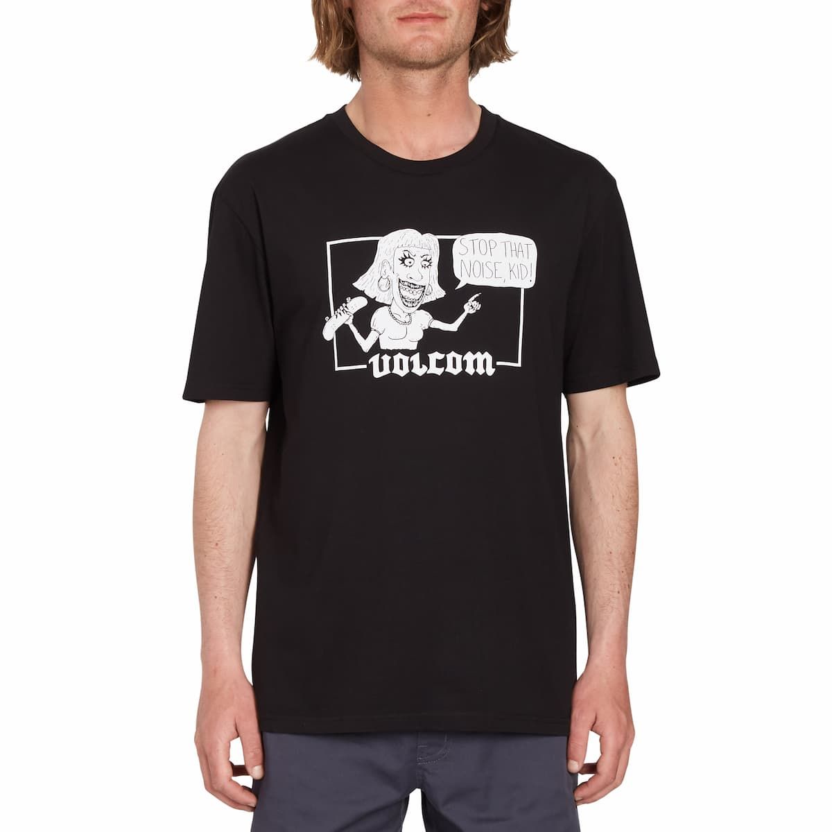 Esta camiseta orgánica de corte clásico cuenta con cuello redondo, manga corta y un dibujo de Harry Lintell junto con la frase "Stop that noise, kid! " (¡Deja de hacer ruido, niño!) estampados en la parte delantera.