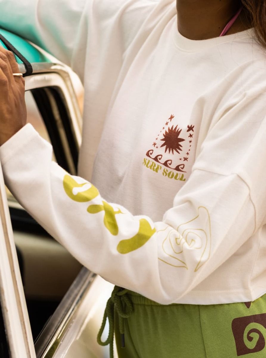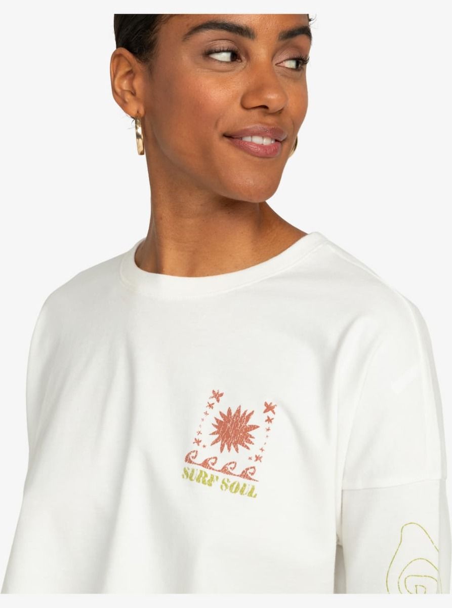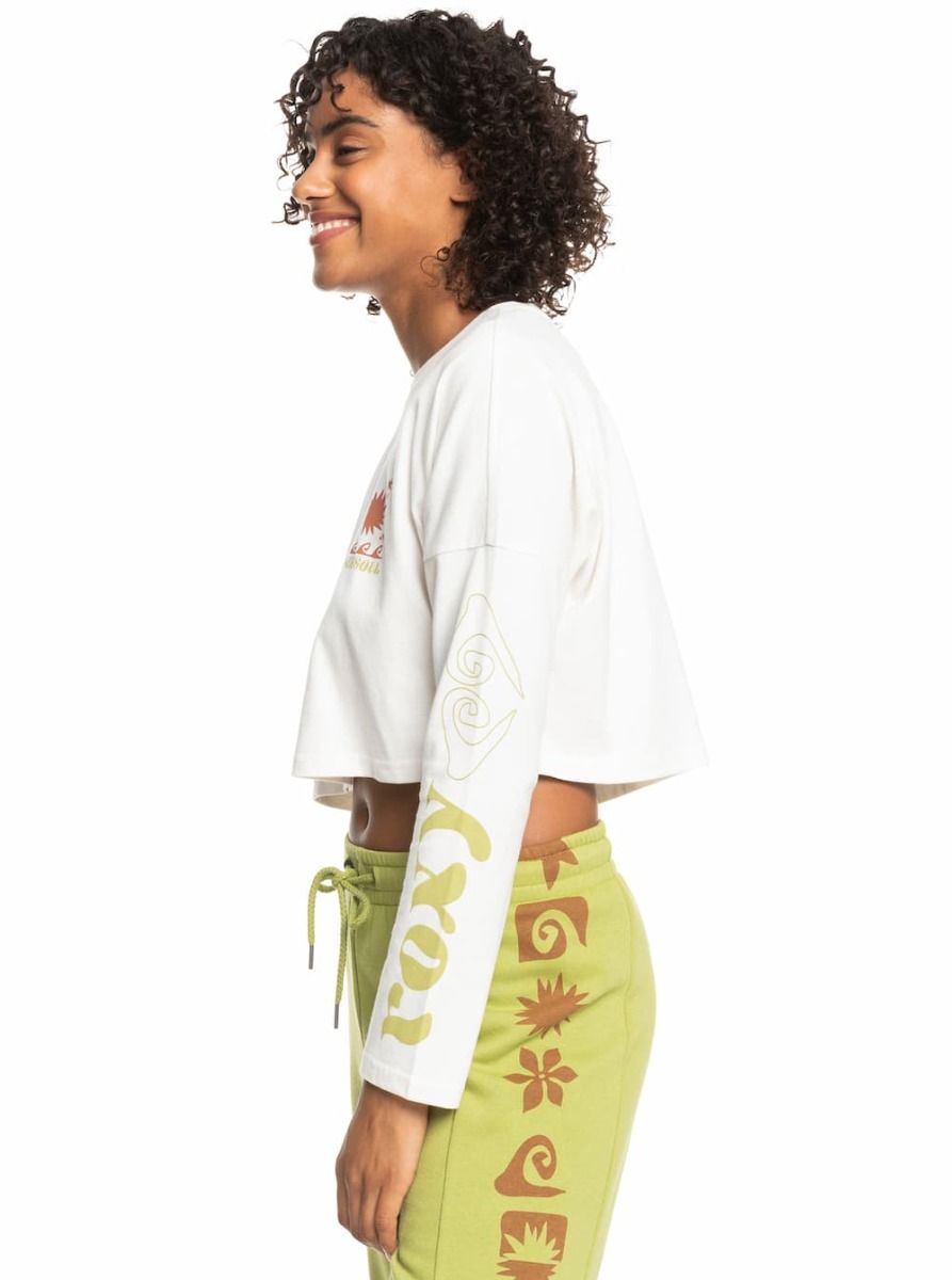 Esta camiseta cropped con manga larga presenta cuello redondo acanalado, estampado artístico Surf Soul en la parte delantera y serigrafiado de efecto desgastado ROXY en las mangas.