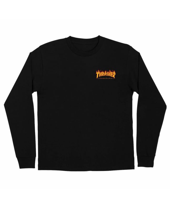 La camiseta de manga larga para hombre Thrasher Flame Dot Men's Longsleeve T-Shirt en negro (Black) de Thrasher y Santa Cruz está confeccionada con 100% algodón de peso medio (5,4oz).