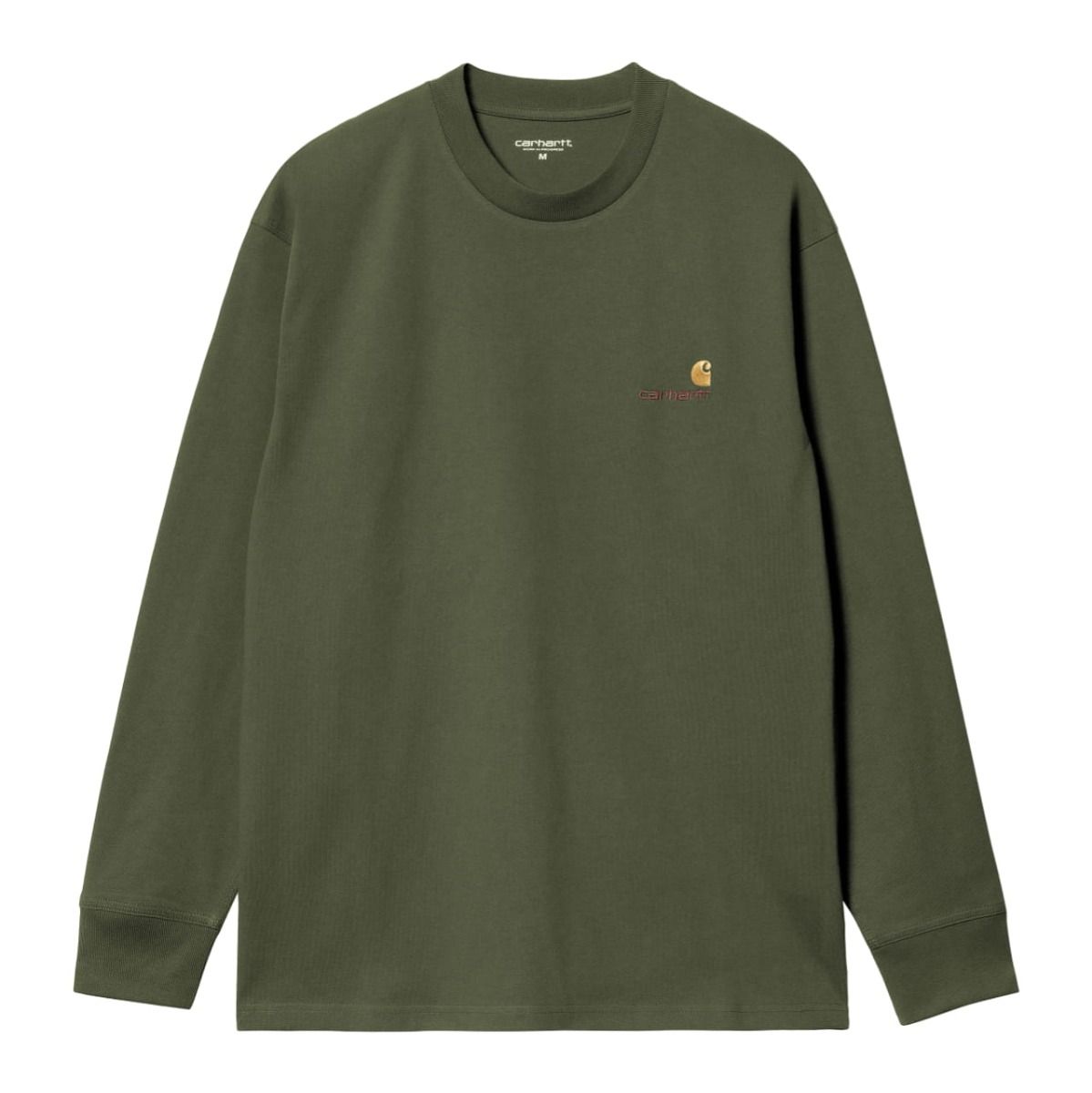 La camiseta de manga larga para hombre L/S American Script T-Shirt en verde estragón (Tarragon) de Carhartt WIP es una prenda esencial que no puede faltar en tu fondo de armario urbano. Con un diseño sencillo, esta camiseta de manga larga es perfecta para cualquier ocasión.