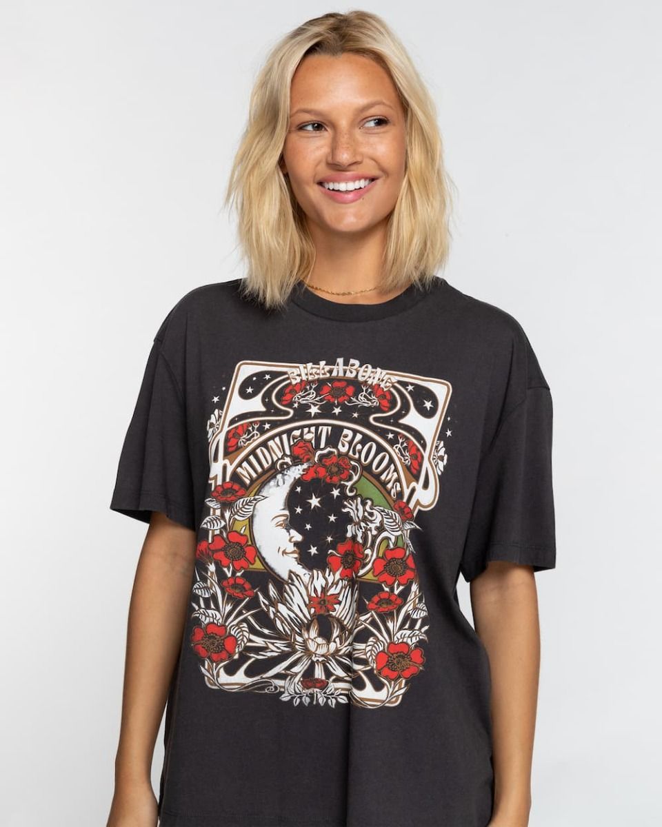 Esta camiseta de corte holgado cuenta con cuello redondo, manga corta y un gráfico artístico de Billabong Midnight Blooms impreso en la parte delantera.