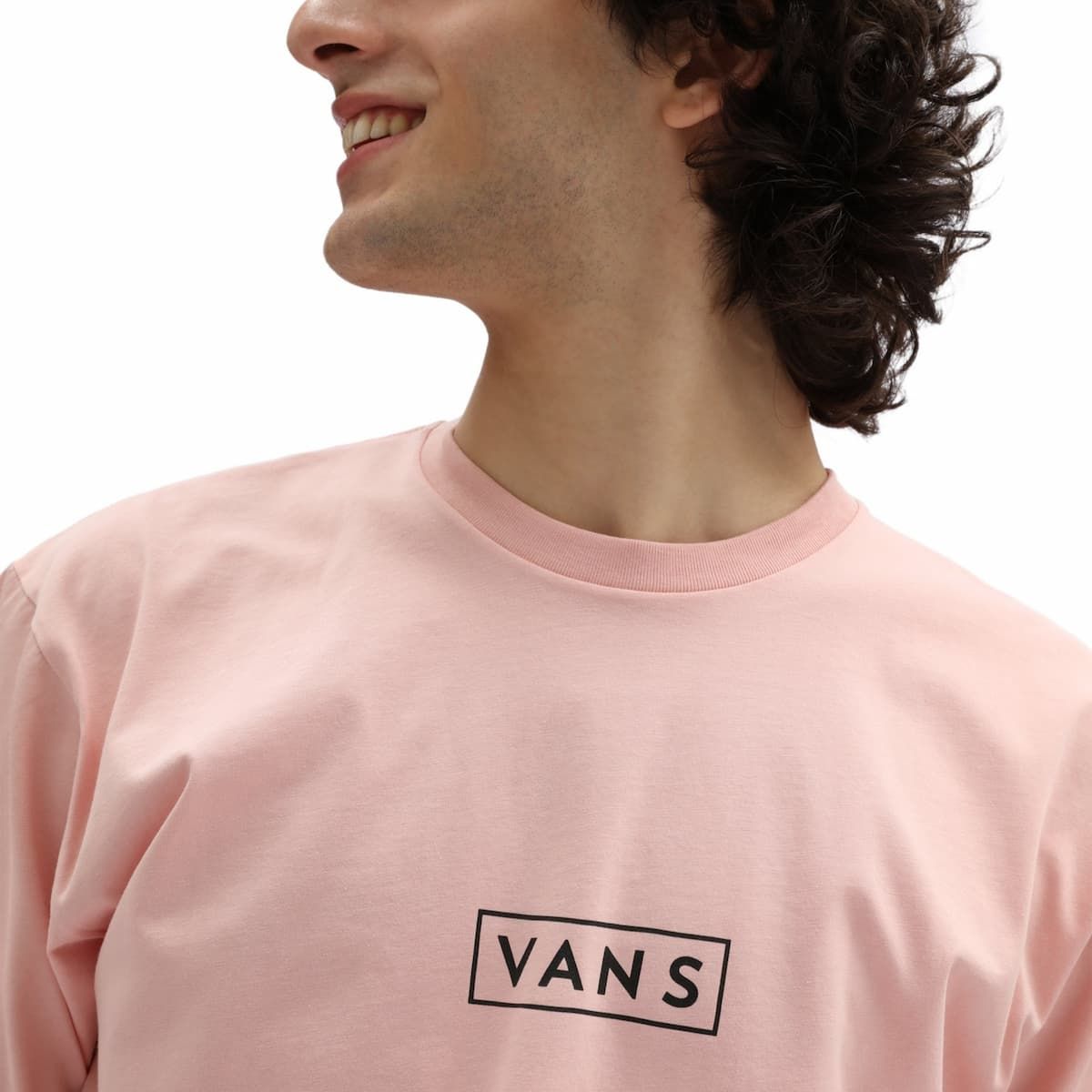 La camiseta de manga corta para hombre Easy Box en rosa con el logo de Vans en negro (Mellow Rose-Black) está confeccionada con tejido de 100% algodón orgánico.