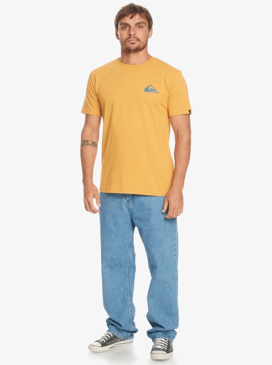Esta camiseta básica color mostaza de corte clásico cuenta con cuello redondo, manga corta, el logo de Quiksilver en color azul serigrafiado en el lado izquierdo del pecho y una discreta etiqueta de la marca tejida en la manga derecha.