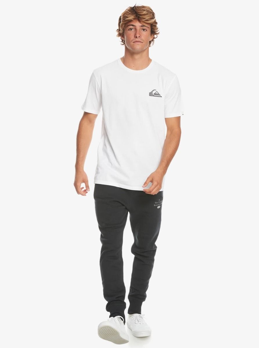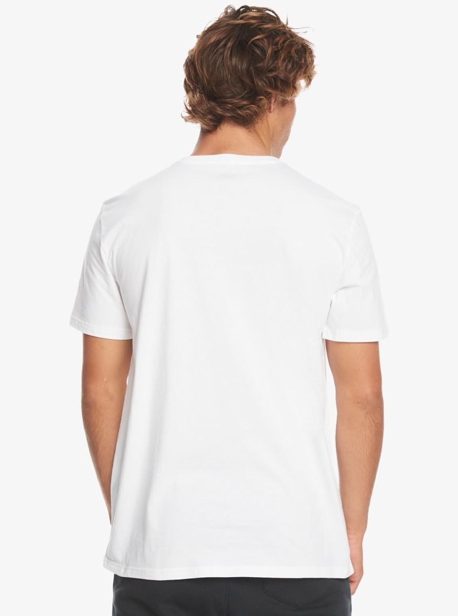 Esta camiseta básica blanca de corte clásico cuenta con cuello redondo, manga corta, el logo de Quiksilver en color negro serigrafiado en el lado izquierdo del pecho y una discreta etiqueta de la marca tejida en la manga derecha.