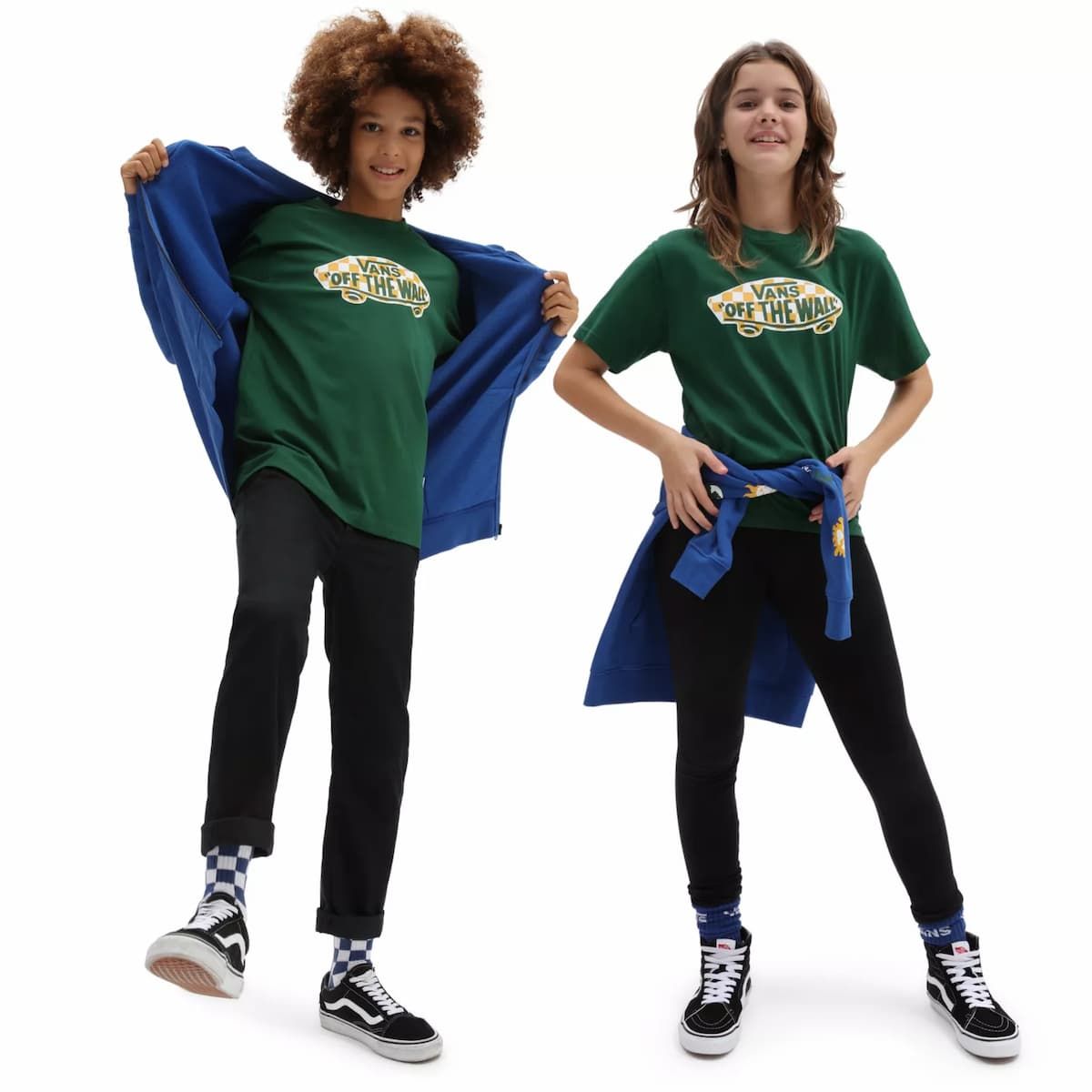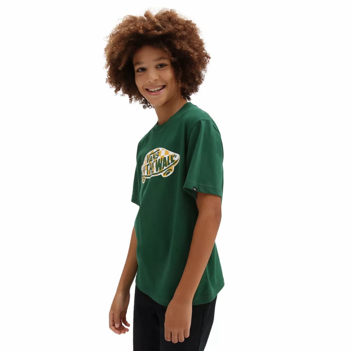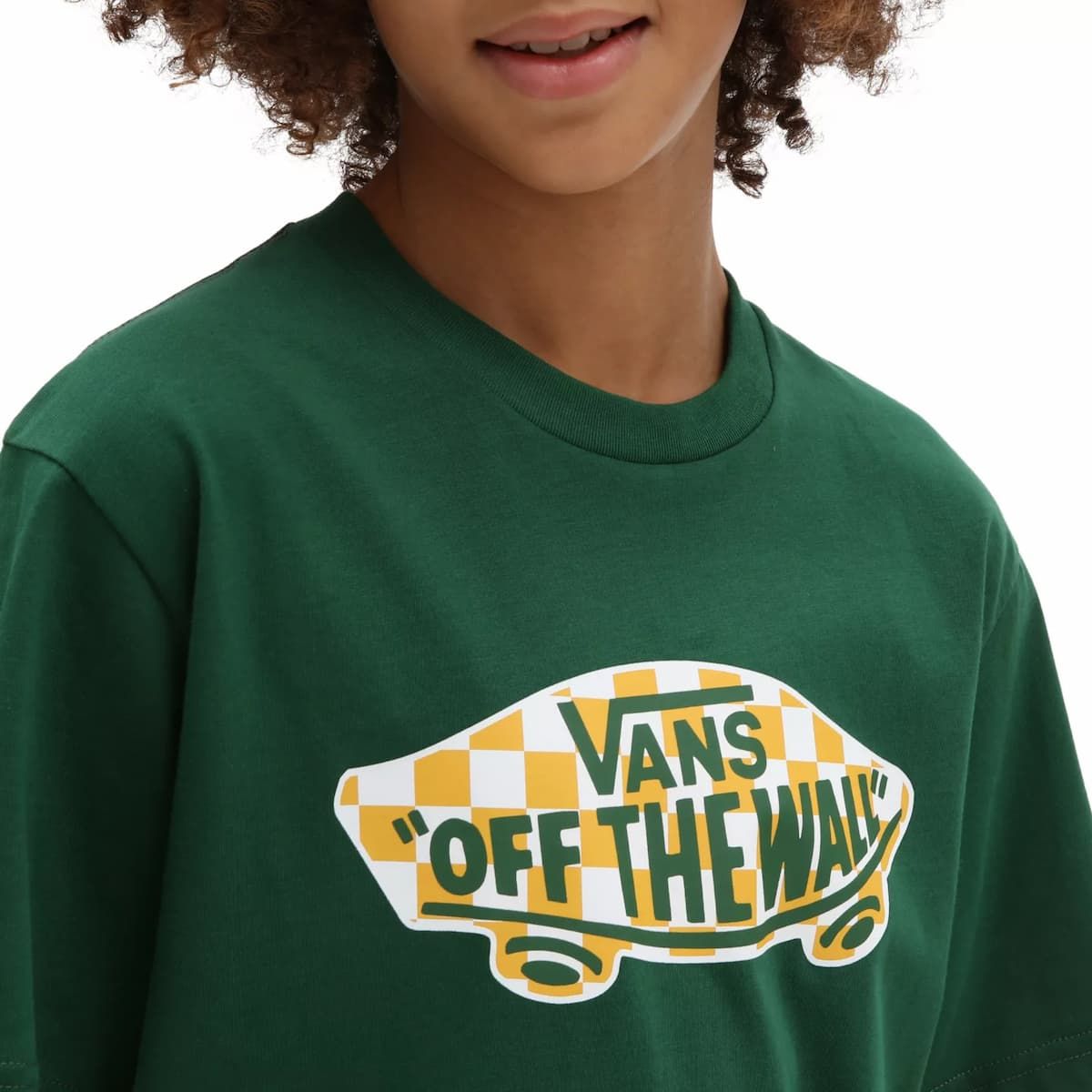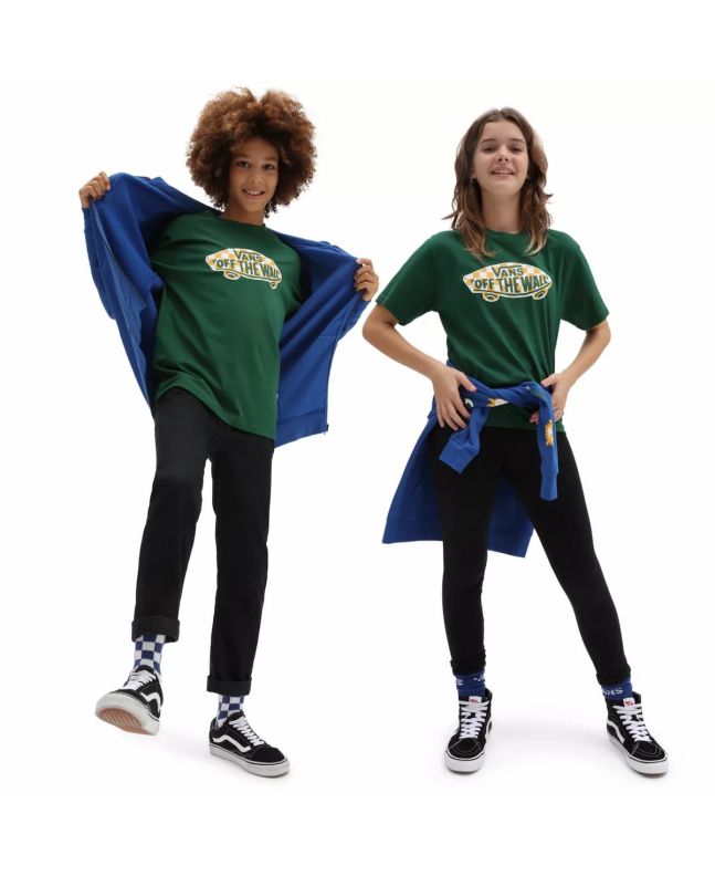 La camiseta para niños y niñas de entre 8 y 14 años OTW Logo Fill en verde con estampado damero (Eden-Checkerboard) de Vans está confeccionada con 100% algodón.