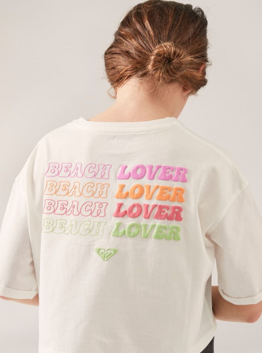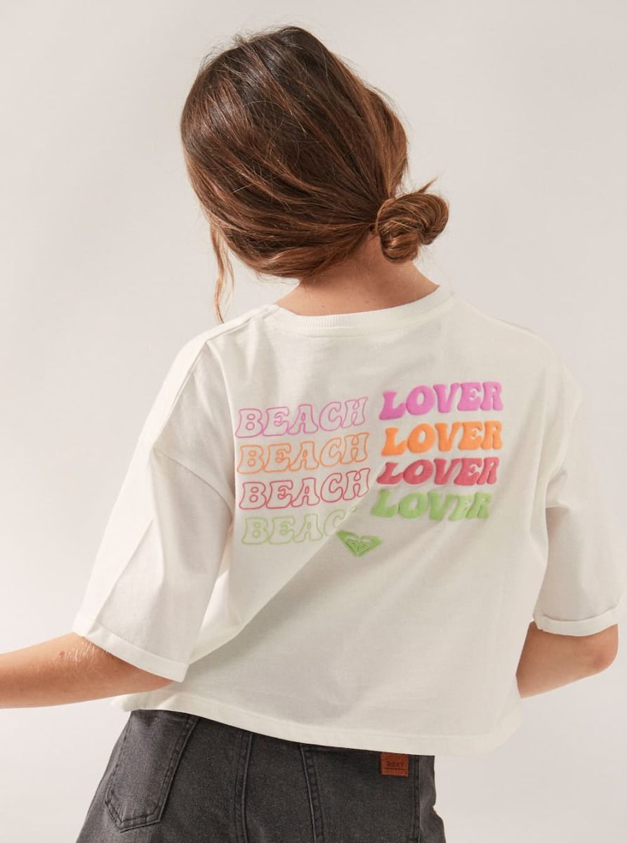 Esta camiseta orgánica de corte cuadrado oversize cuenta con cuello redondo, manga corta, sisas bajas, bordes de las mangas enrollados, bordado ROXY en el lado izquierdo del pecho y bordado Beach Lover en la espalda.