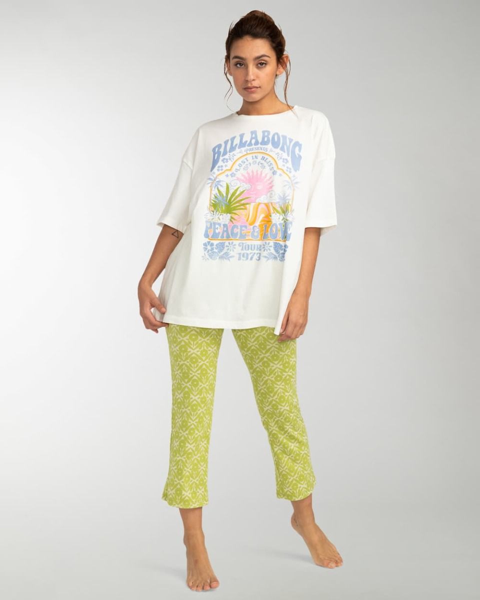 Esta camiseta de corte holgado, perteneciente a la Colección Dreamland de Billabong, cuenta con cuello redondo, manga corta y un gráfico de Billabong Peace & Love (Paz y Amor) estampado en la parte delantera.