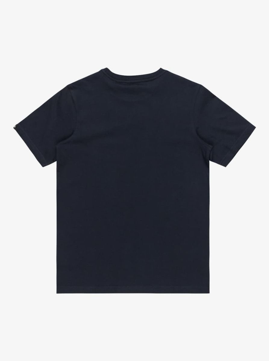 Esta camiseta juvenil azul marino oscuro presenta corte clásico y cómodo, cuello redondo, manga corta, el logo de la ola y la montaña de Quiksilver serigrafiado en tono azul celeste en la parte delantera, junto con una pequeña etiqueta de la marca tejida en la manga izquierda.