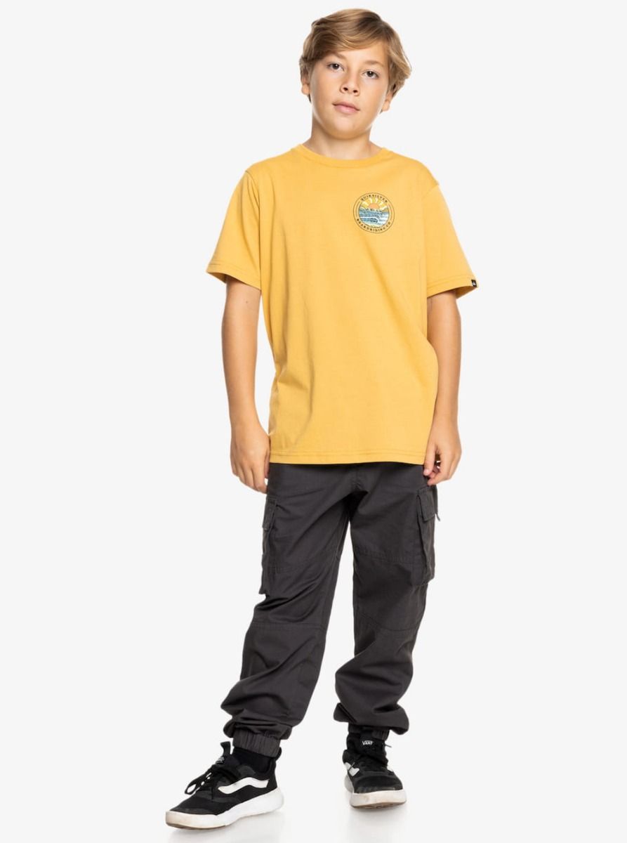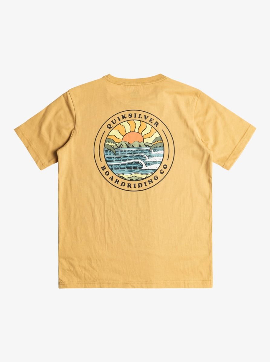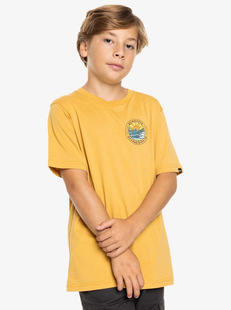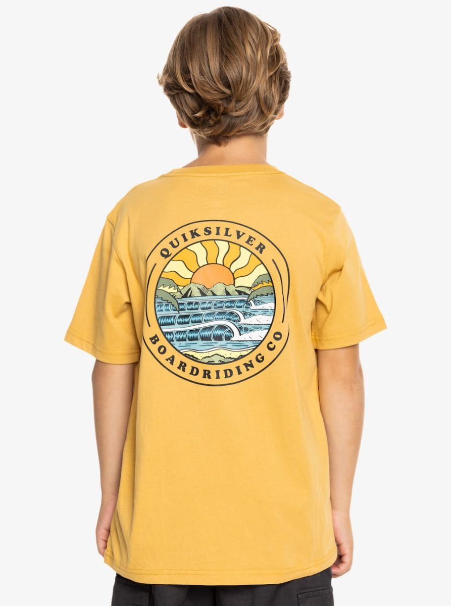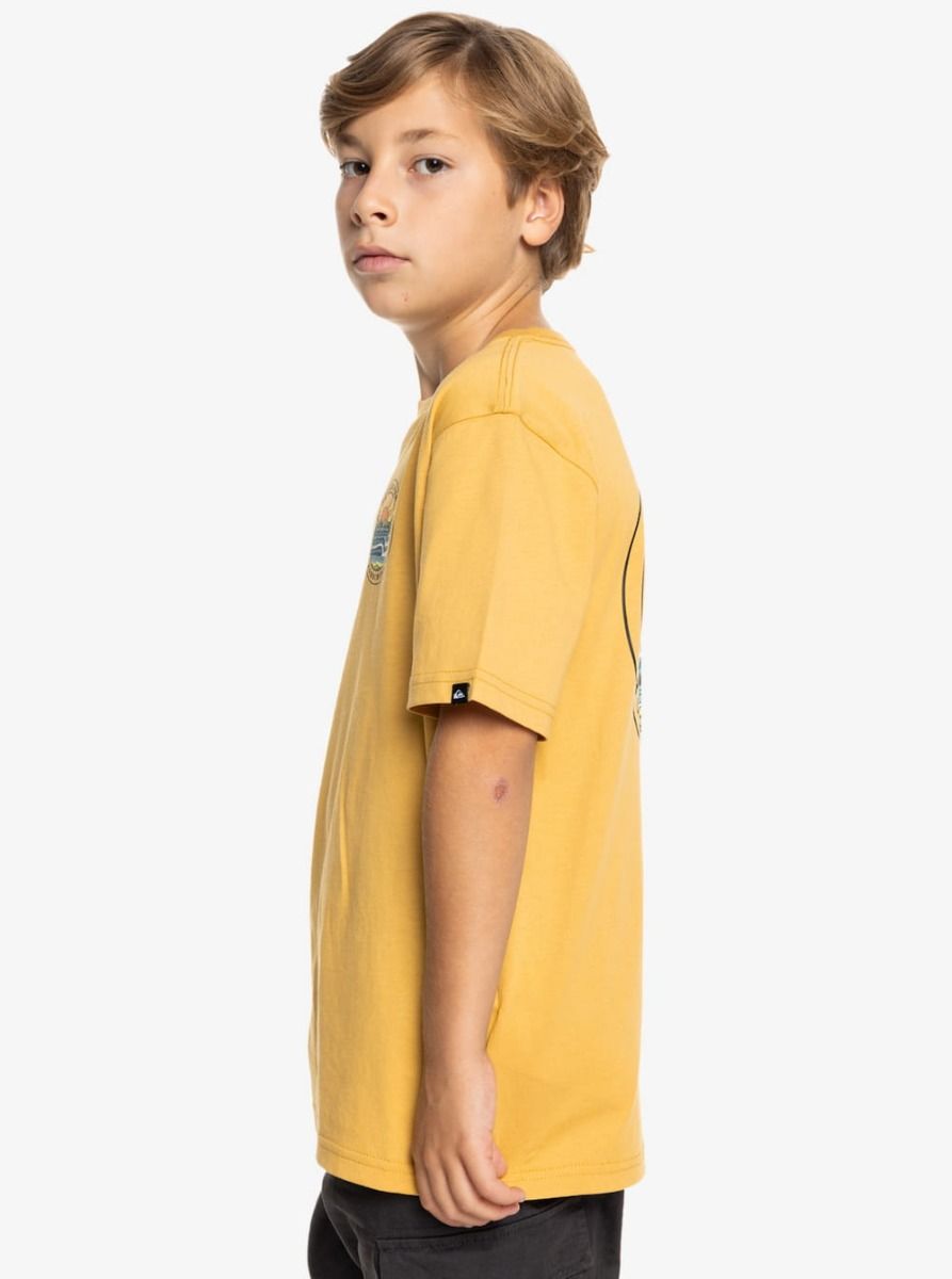 Esta camiseta juvenil amarilla presenta corte clásico y cómodo, cuello redondo, manga corta, serigrafiado Quiksilver Boardriding Co. inspirado en el mar impreso en el pecho y la espalda, junto con una pequeña etiqueta de la marca tejida en la manga izquierda.