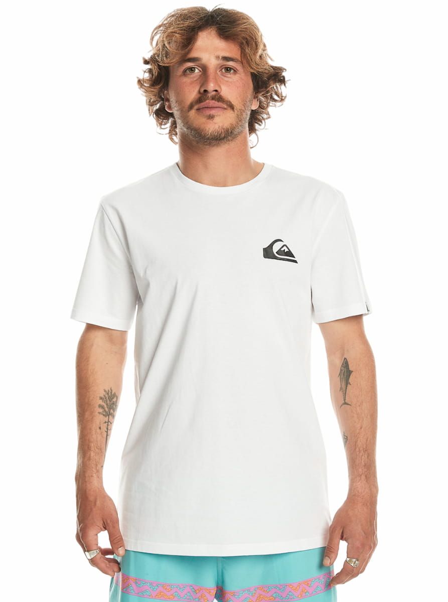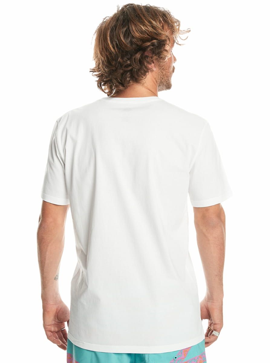 Esta camiseta blanca cuenta con ajuste regular, cuello redondo, manga corta, el logo de Quiksilver en color negro estampado en alta definición en el lado izquierdo del pecho y una discreta etiqueta de la marca tejida en la manga derecha.