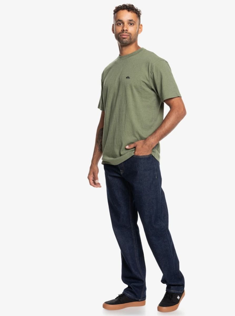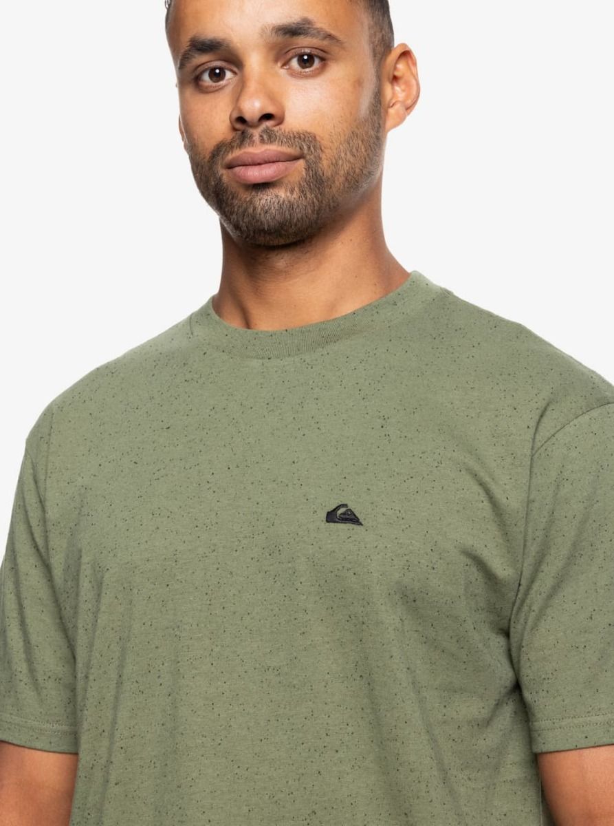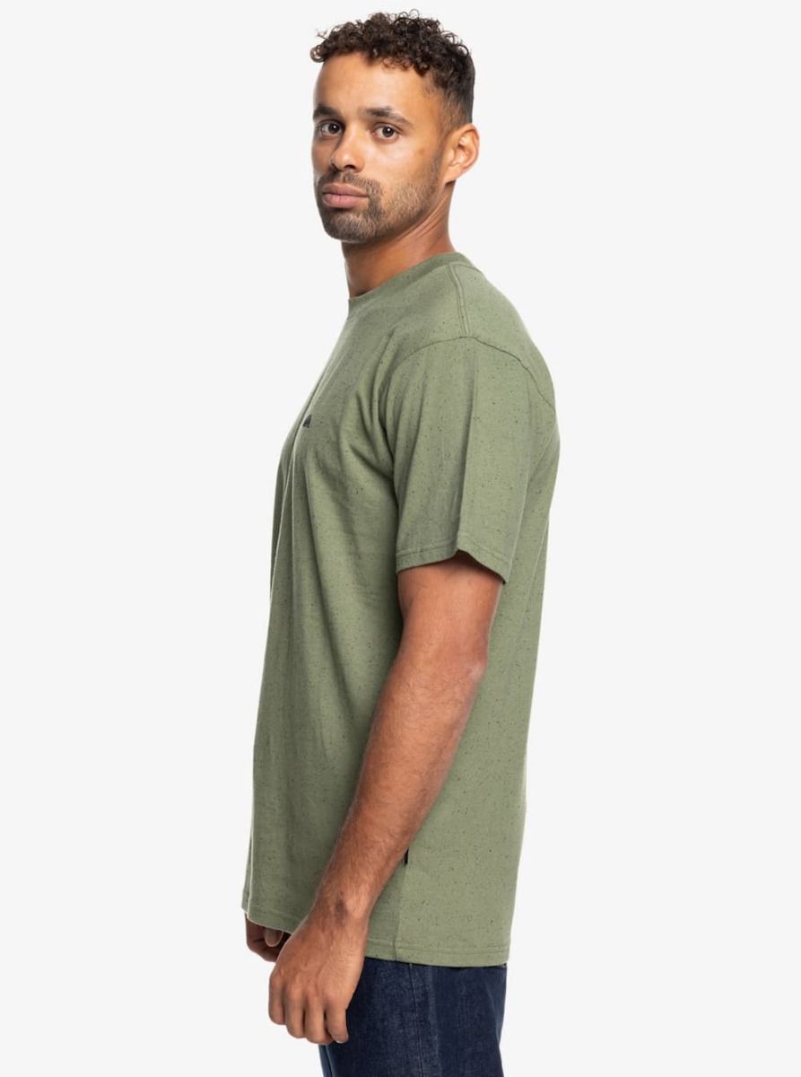 Esta camiseta verde para hombre presenta corte normal, cuello redondo, manga corta, junto con el logo de Quiksilver bordado en negro en el lado izquierdo del pecho.