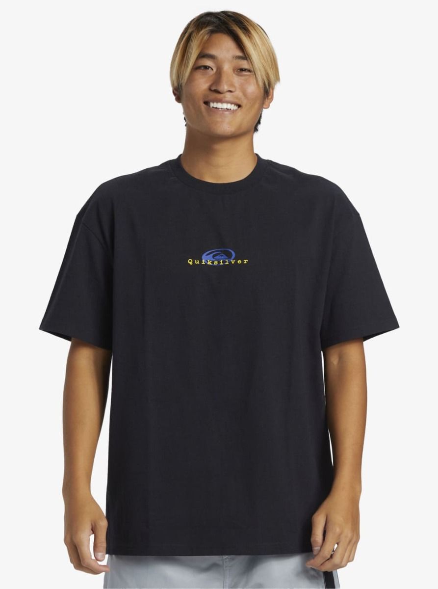 Esta camiseta negra presenta corte extra-grande, cuello redondo, manga corta, junto con serigrafiado suave de la Colección Quiksilver Mercury en la parte delantera y posterior.