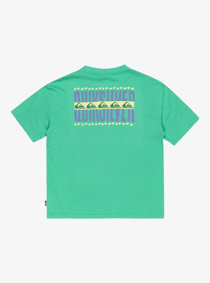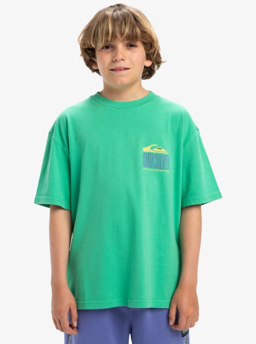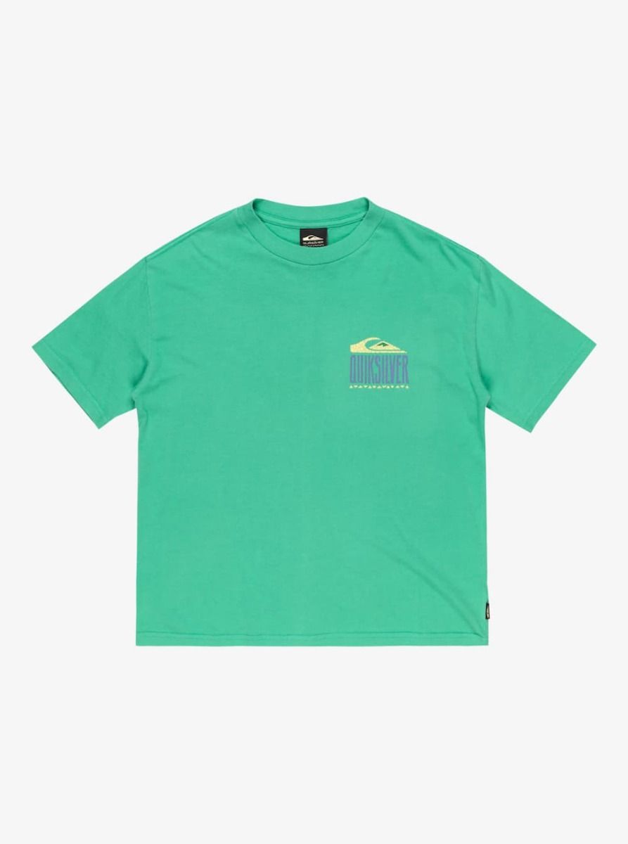 Camiseta Quiksilver para niño con estampado gráfico retro en verde Green Spruce. Algodón orgánico suave y corte cómodo.