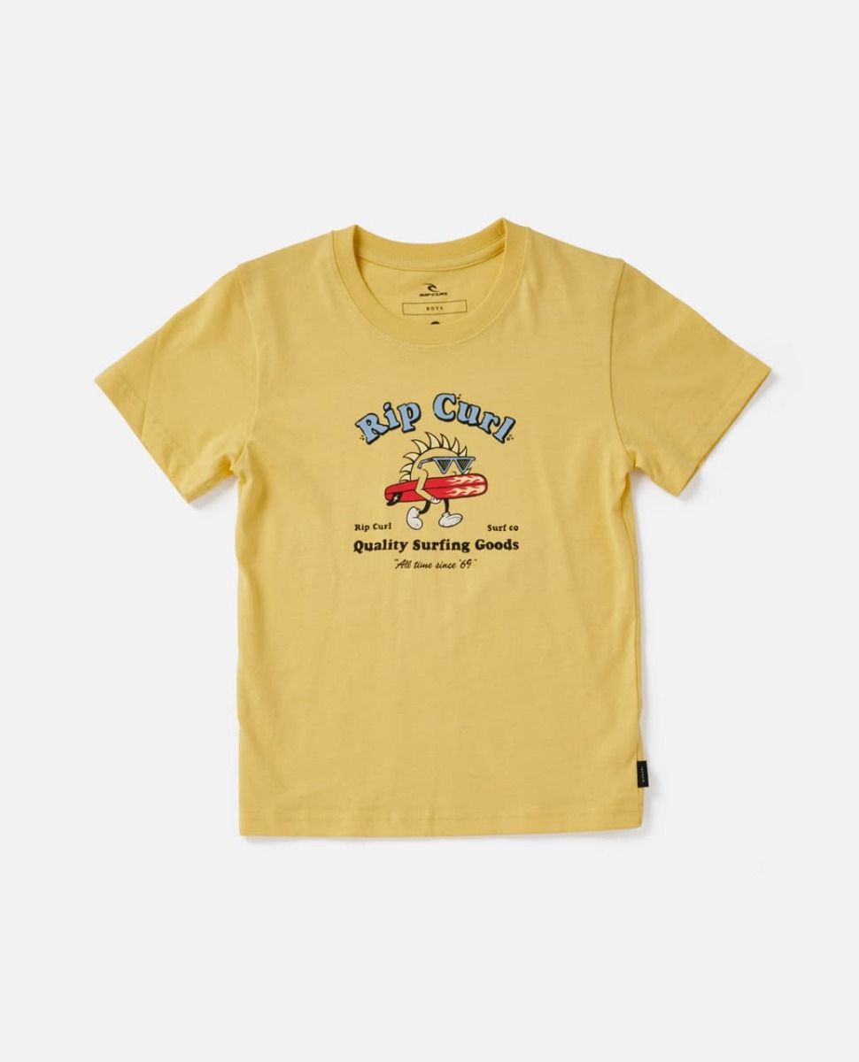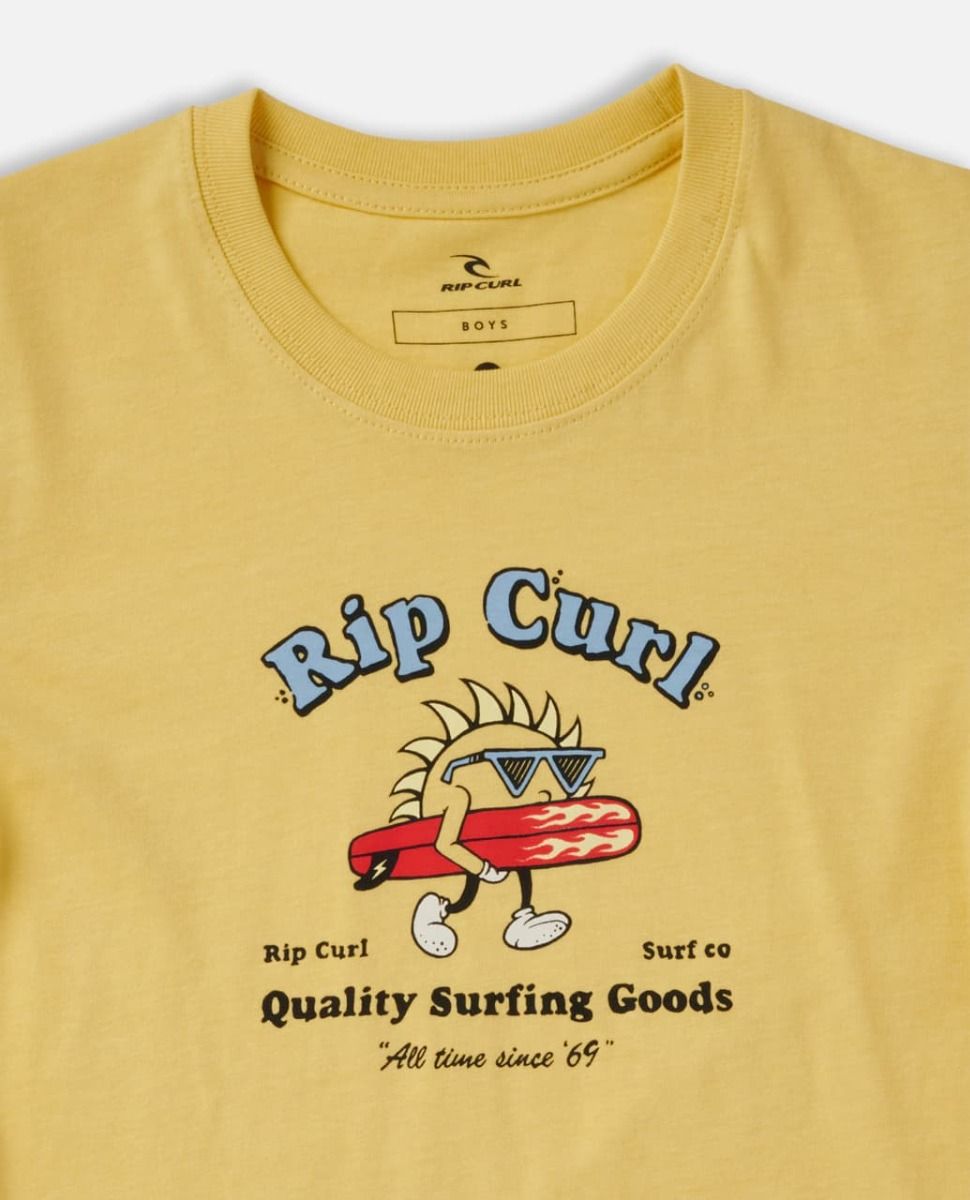Esta camiseta surfera infantil cuenta con ajuste estándar, cuello redondo, manga corta y un estampado original de Rip Curl Quality Surfing Goods impreso en el pecho.