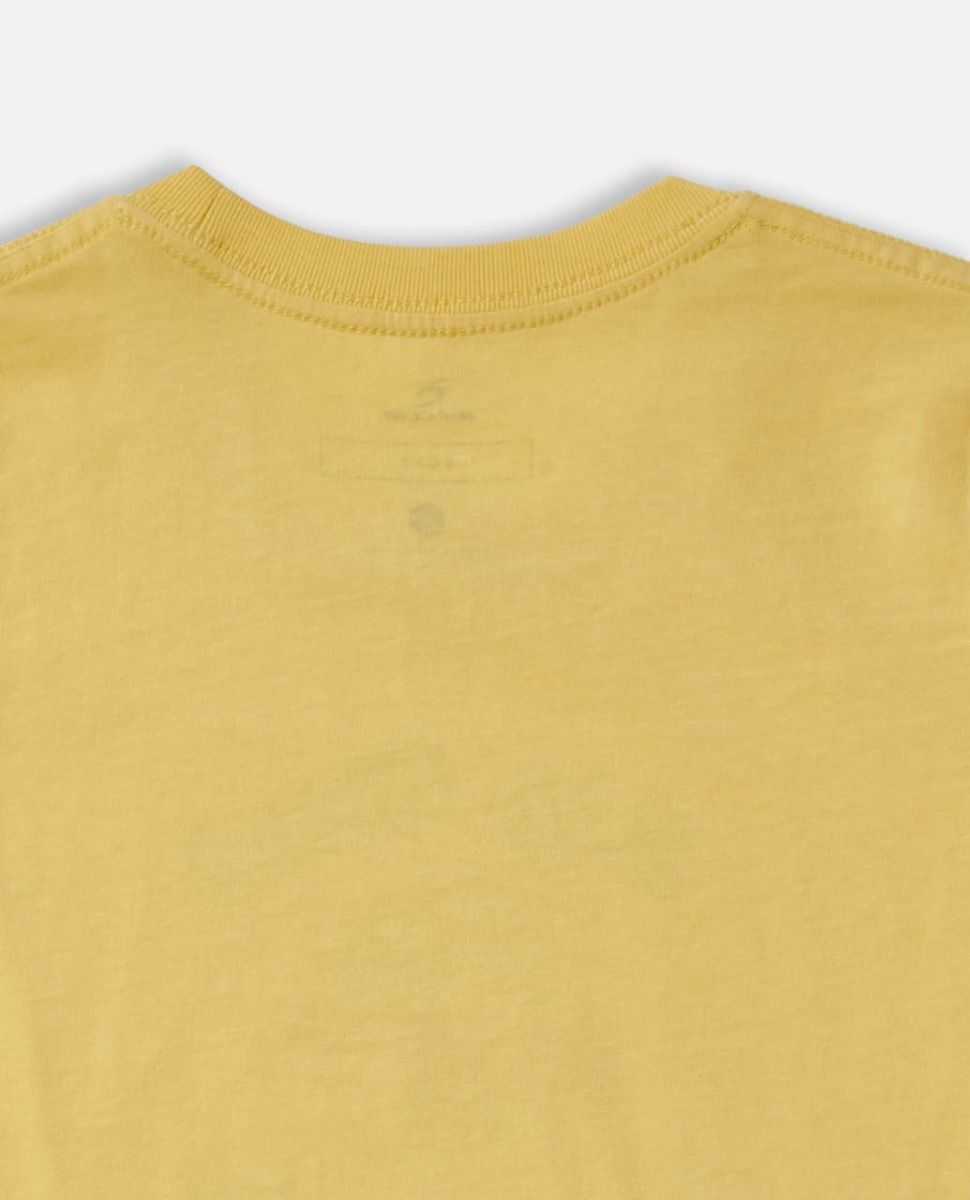 La camiseta de manga corta Micro Waves Art Kids amarilla para niño tiene una discreta etiqueta de garantía Rip Curl tejida en el lateral.
