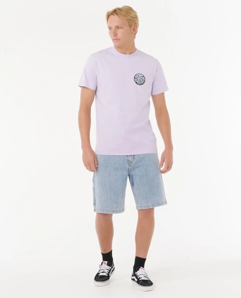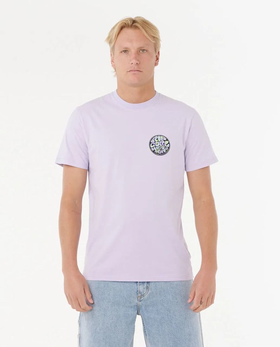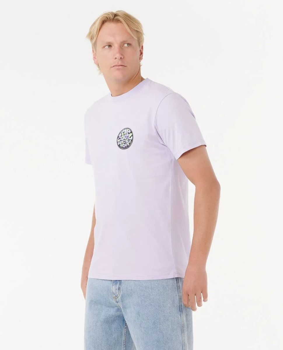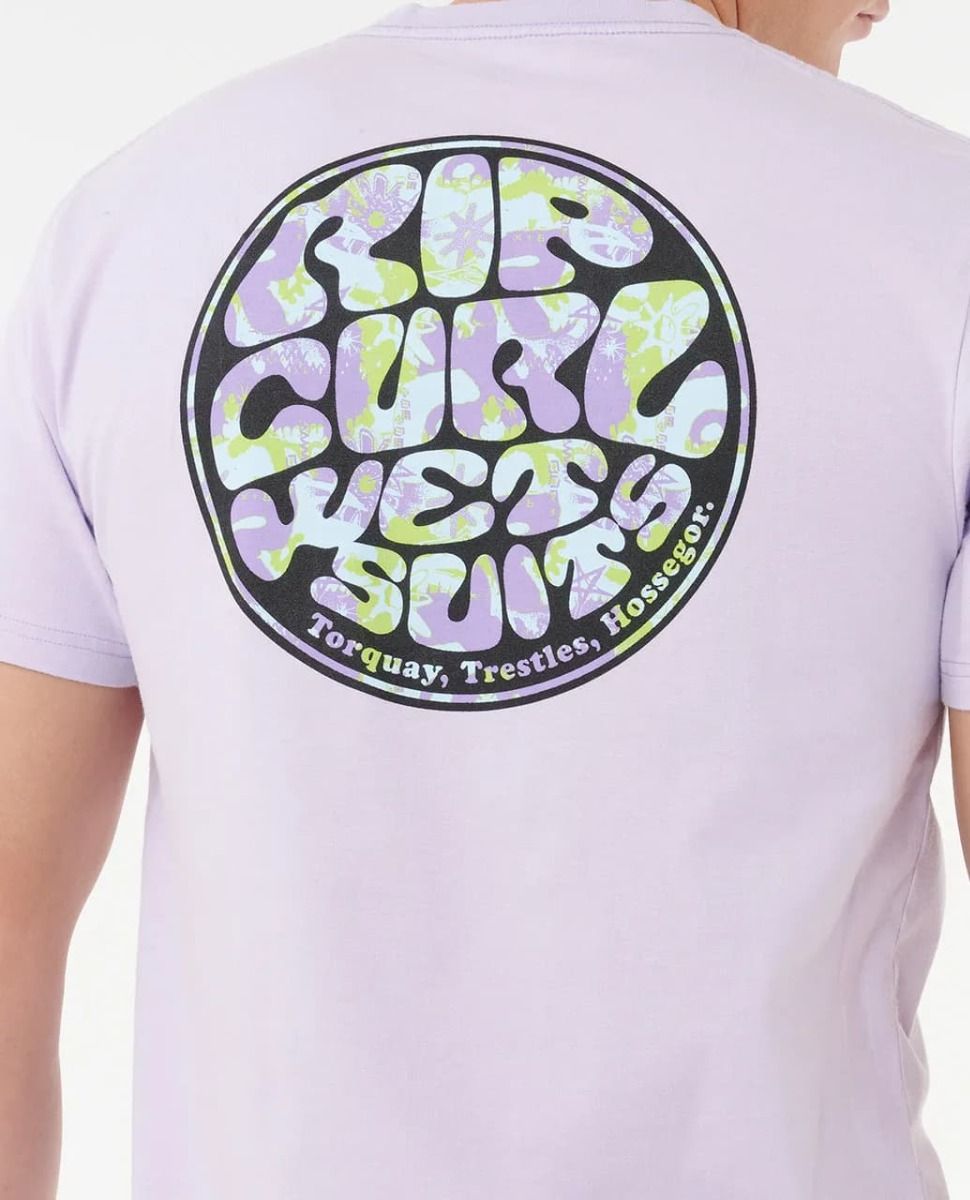Camiseta Rip Curl de algodón orgánico en color lavanda con estampado icónico frontal y trasero. Cómoda, ligera y perfecta para el look surfista diario.