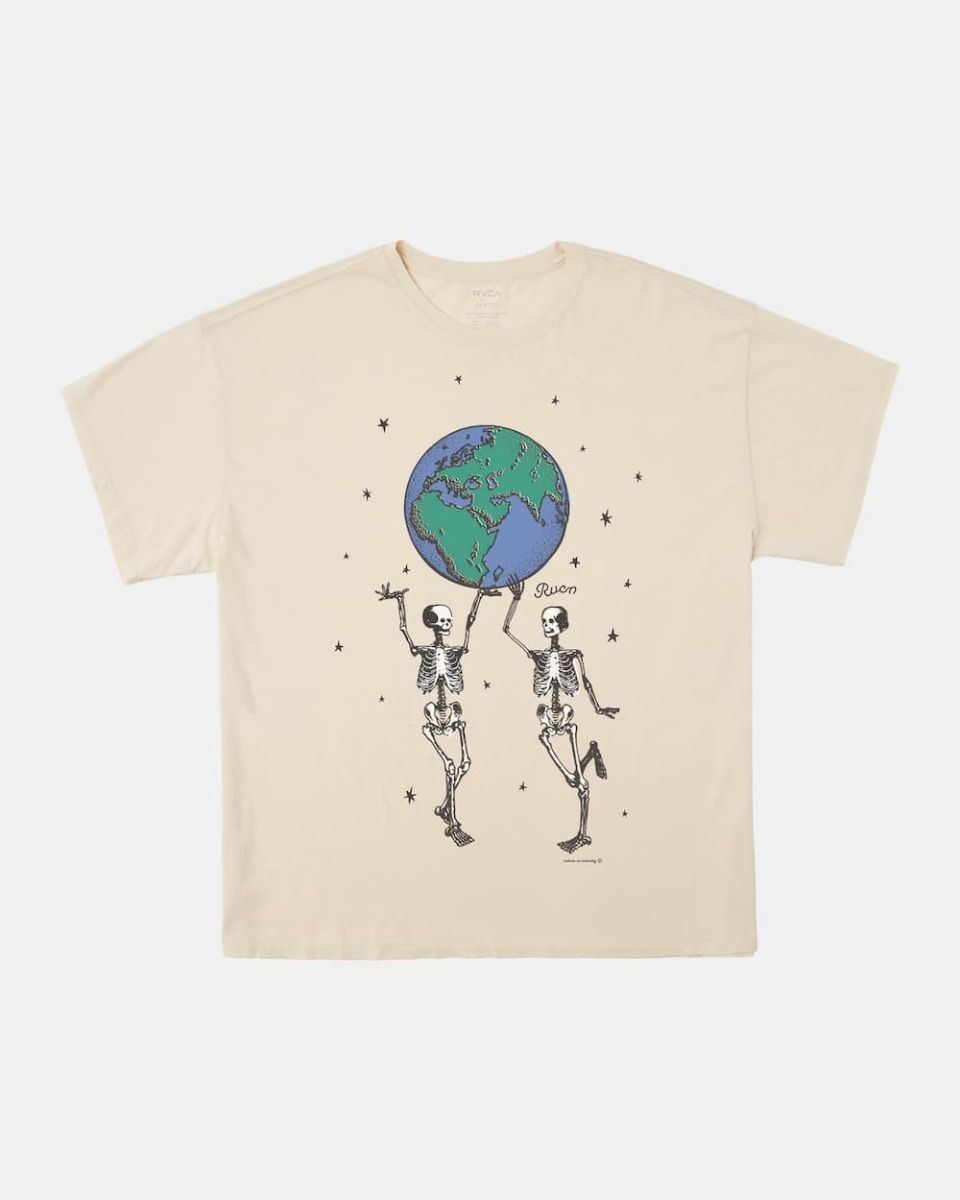 Esta camiseta orgánica de corte extragrande cuenta con cuello redondo, manga corta y un gráfico original de dos esqueletos y la Tierra serigrafiados en la parte delantera.