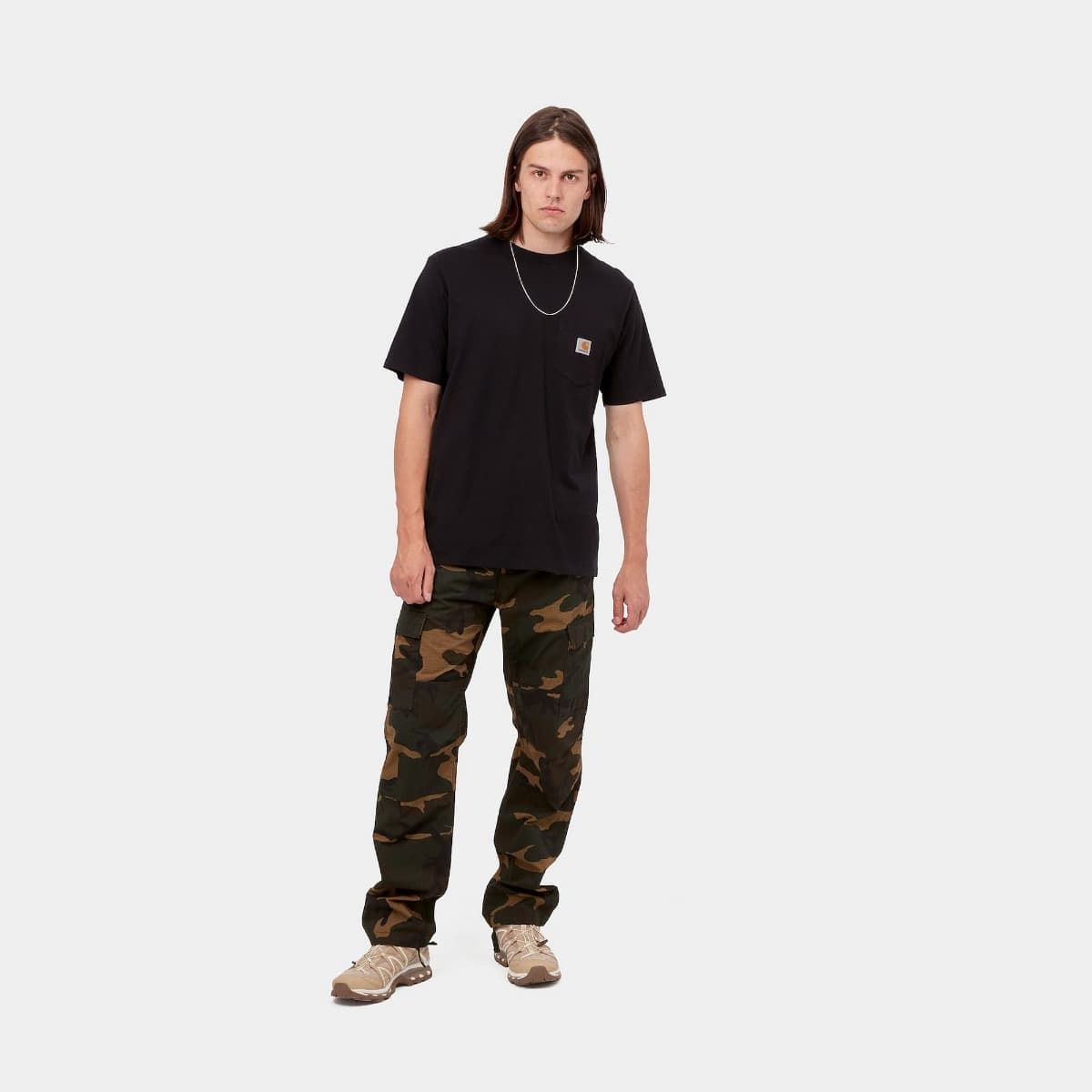 Esta camiseta de ajuste regular para hombre cuenta con cuello redondo, manga corta, bolsillo en el pecho y una etiqueta cuadrada con el logo de Carhartt tejida en el bolsillo.