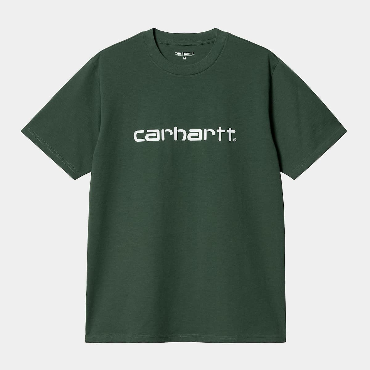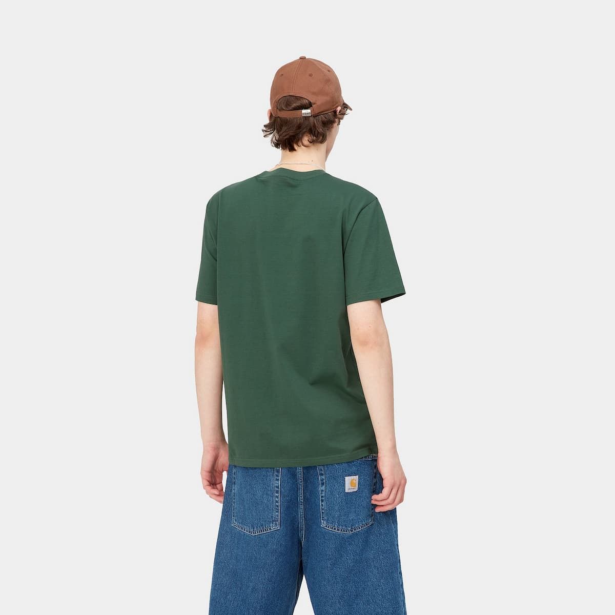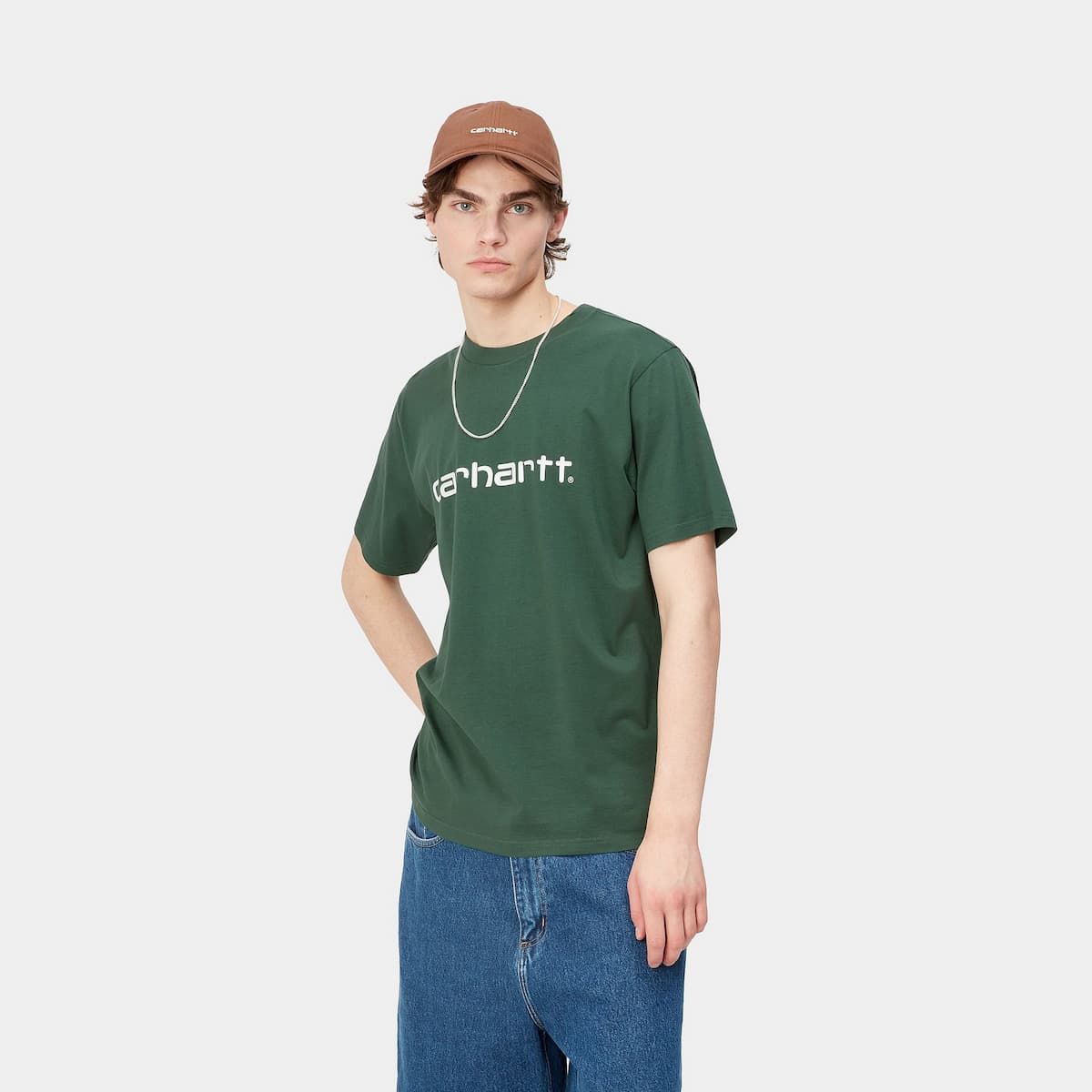 La camiseta de manga corta para hombre S/S Script T-Shirt en verde con el logo en blanco (Treehouse/White) de Carhartt WIP está confeccionada con tejido punto jersey de algodón sencillo (190g/sqm).