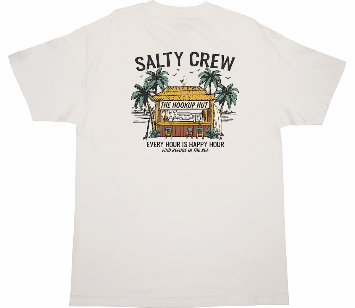 Esta camiseta de tejido suave cuenta con cuello redondo, manga corta y estampado original Salty Crew de una cabaña junto con la leyenda "Every hour is happy hour. Find refuge in the sea" (Cada hora es la hora feliz. Encuentra refugio en el mar) serigrafiados en el lado izquierdo del pecho y en la espalda.