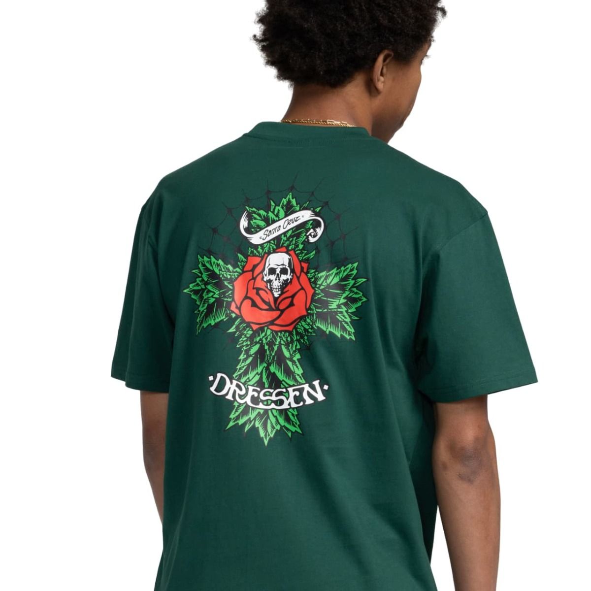 Esta camiseta skater verde presenta corte clásico, manga corta y cuello redondo para un ajuste cómodo, junto con serigrafiados inspirados en Eric Dressen y Santa Cruz Cruz Skateboards impresos en el lado izquierdo del pecho y en la espalda.