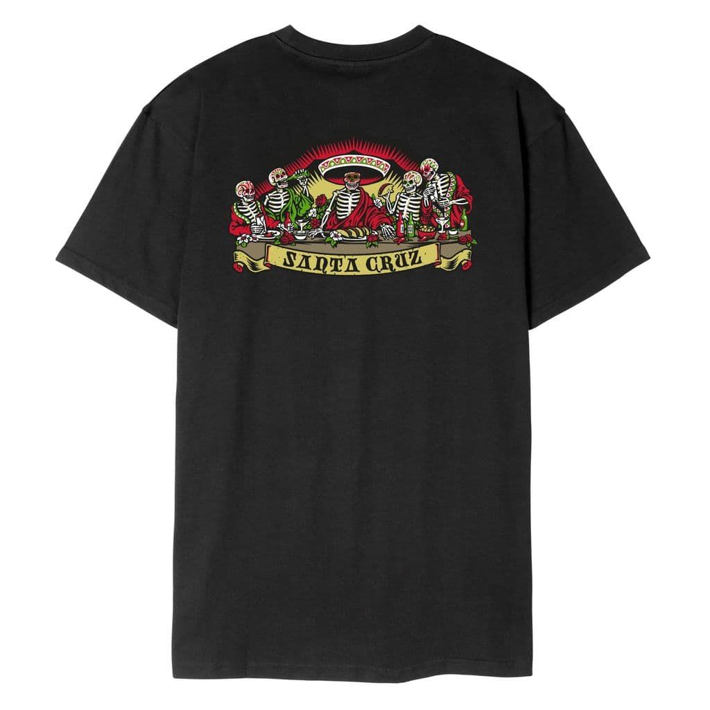 El protagonista de esta camiseta es su gráfico trasero: un grupo de esqueletos con sombreros tradicionales, compartiendo una escena festiva y surrealista que recuerda al Día de los Muertos. En el pecho izquierdo, una calavera solitaria con sombrero y el logo Santa Cruz ponen el broche de oro a un diseño que mezcla cultura, irreverencia y estilo skater.
