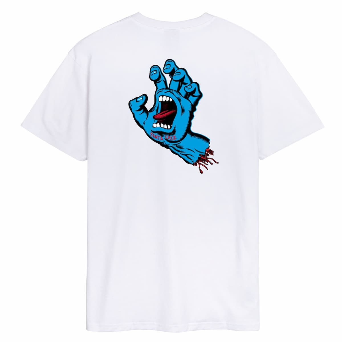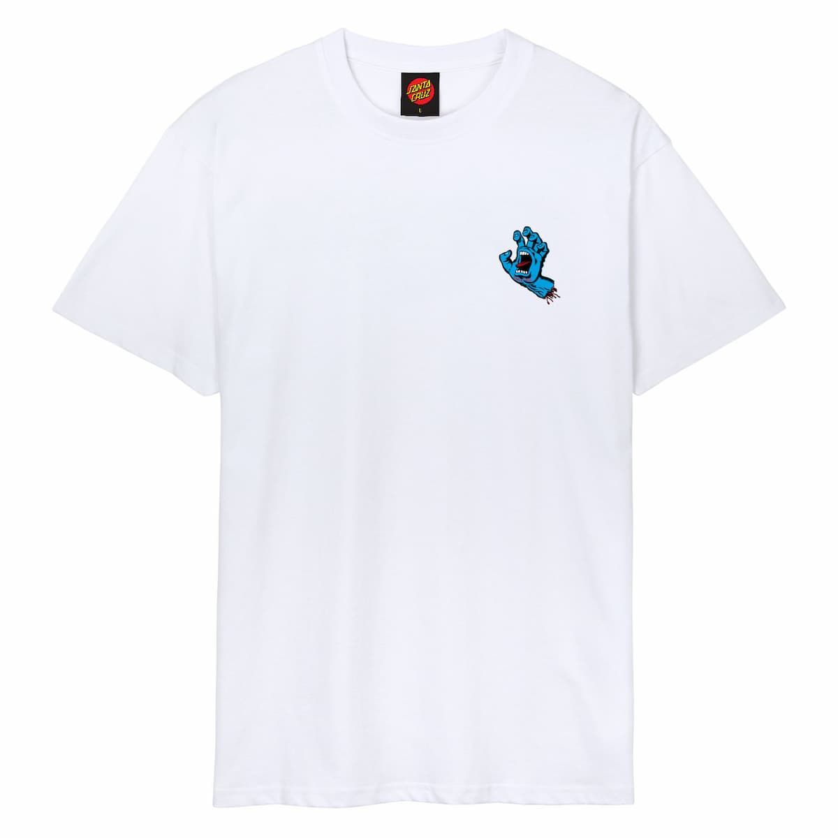 Esta icónica camiseta orgánica blanca de ajuste regular cuenta con cuello redondo, manga corta y el inconfundible gráfico "Screaming Hand" de Santa Cruz impreso en el lado izquierdo del pecho y en la espalda.