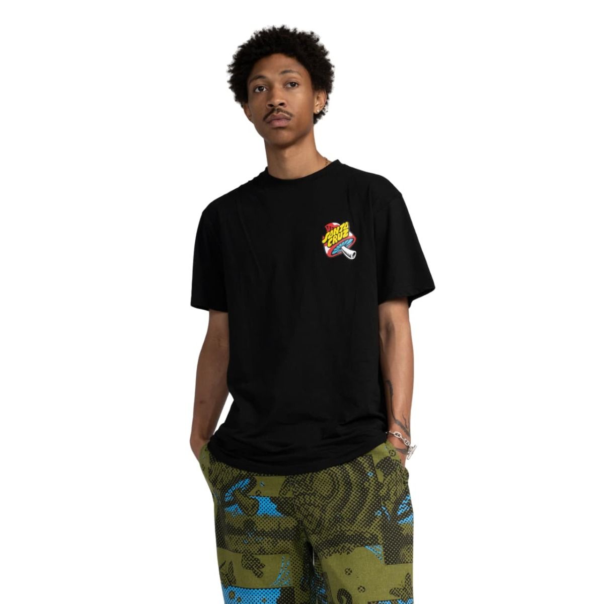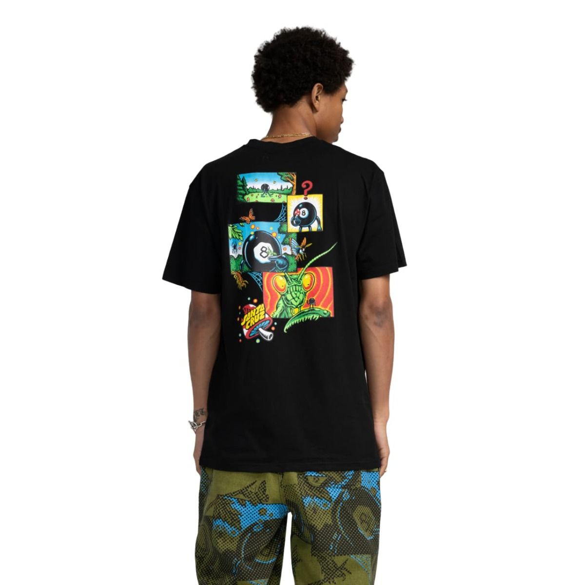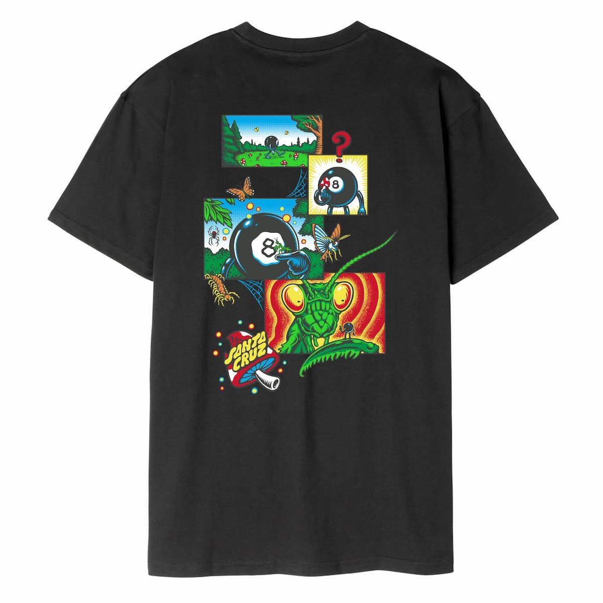 Esta cómoda camiseta orgánica de ajuste regular cuenta con cuello redondo, manga corta, serigrafiado Santa Cruz con una seta en el lado izquierdo del pecho, junto con un gráfico de Santa Cruz y Erik Winkowski de una bola 8 de billar e inspirado en la naturaleza con vegetación, setas y una mantis religiosa impreso en la parte delantera y posterior.
