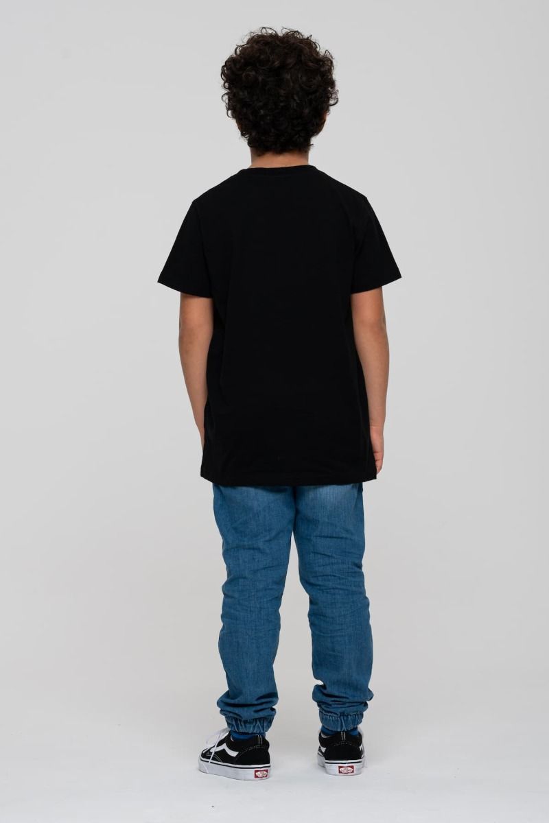 La camiseta de manga corta Youth Flamed Not a Dot Front negra tiene una etiqueta de garantía Santa Cruz en el cuello interior.