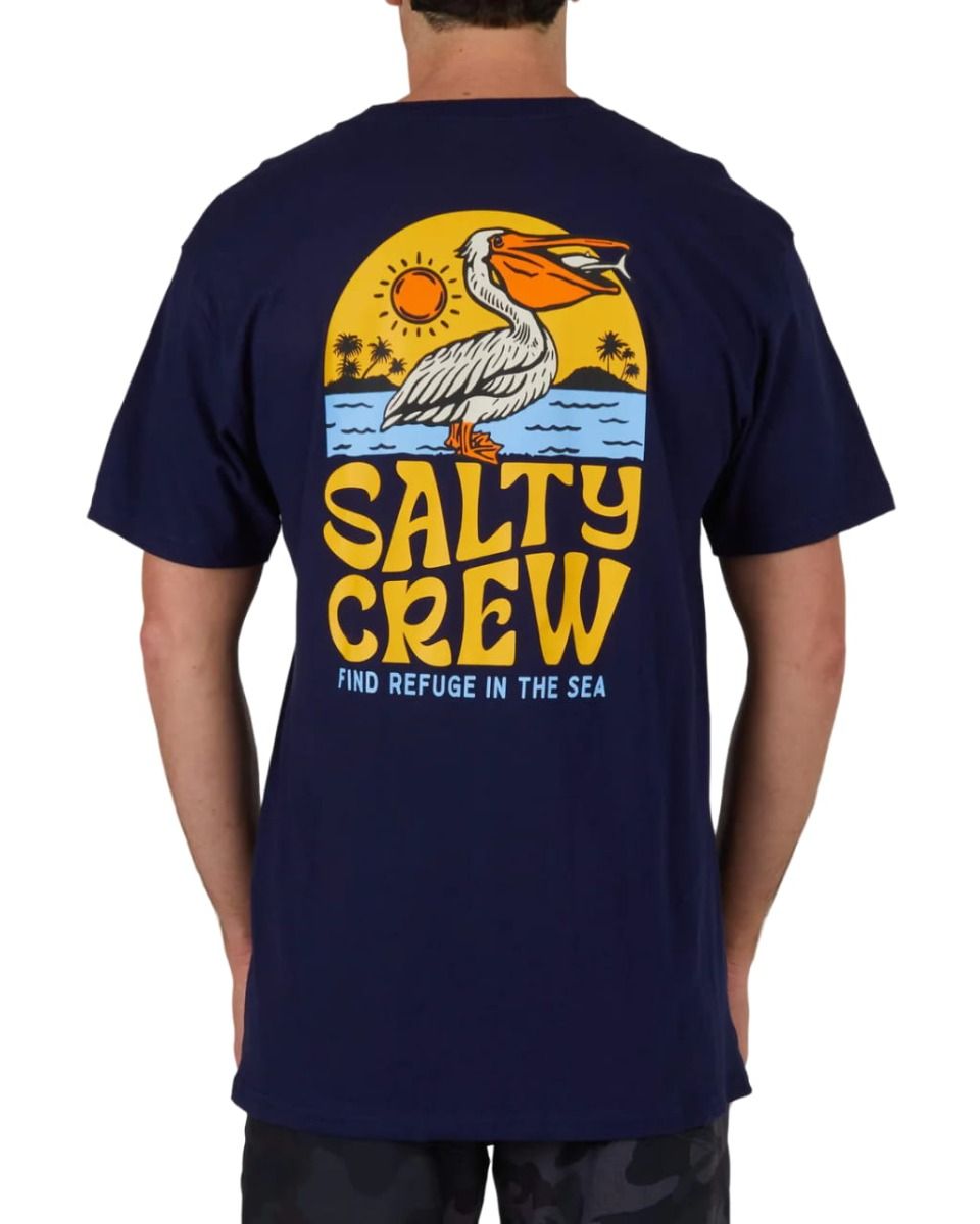 Esta camiseta veraniega azul marino inspirada en el mar cuenta con corte clásico, cuello redondo, manga corta, un gráfico original Salty Crew de un pelícano impreso en el lado izquierdo del pecho y en la espalda, el emblemático lema de la marca: "Find Refuge in the Sea" (Encuentra refugio en el mar”) serigrafiado en la espalda, así como una etiqueta con el logo tejida en la manga izquierda.