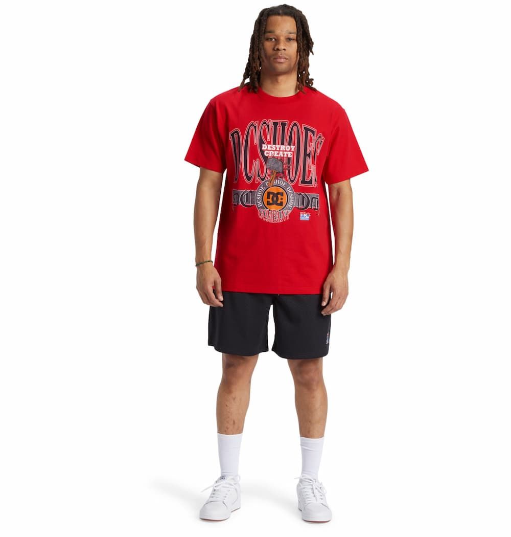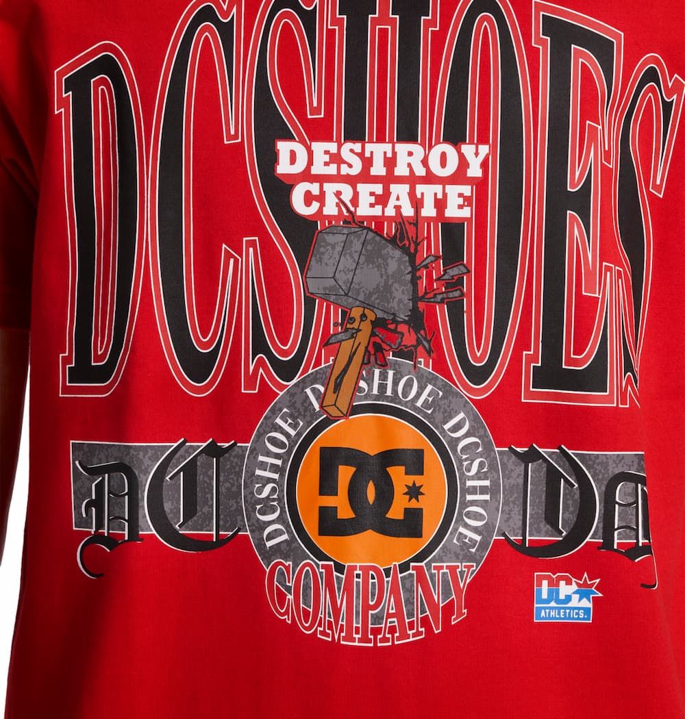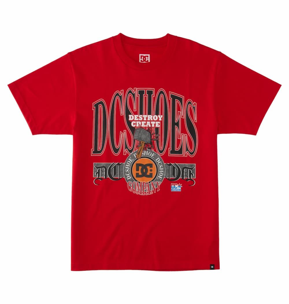 Esta camiseta en intenso tono rojo presenta ajuste estándar, cuello redondo acanalado, manga corta y estampado DC Shoes-Destroy-Create impreso en la parte delantera.