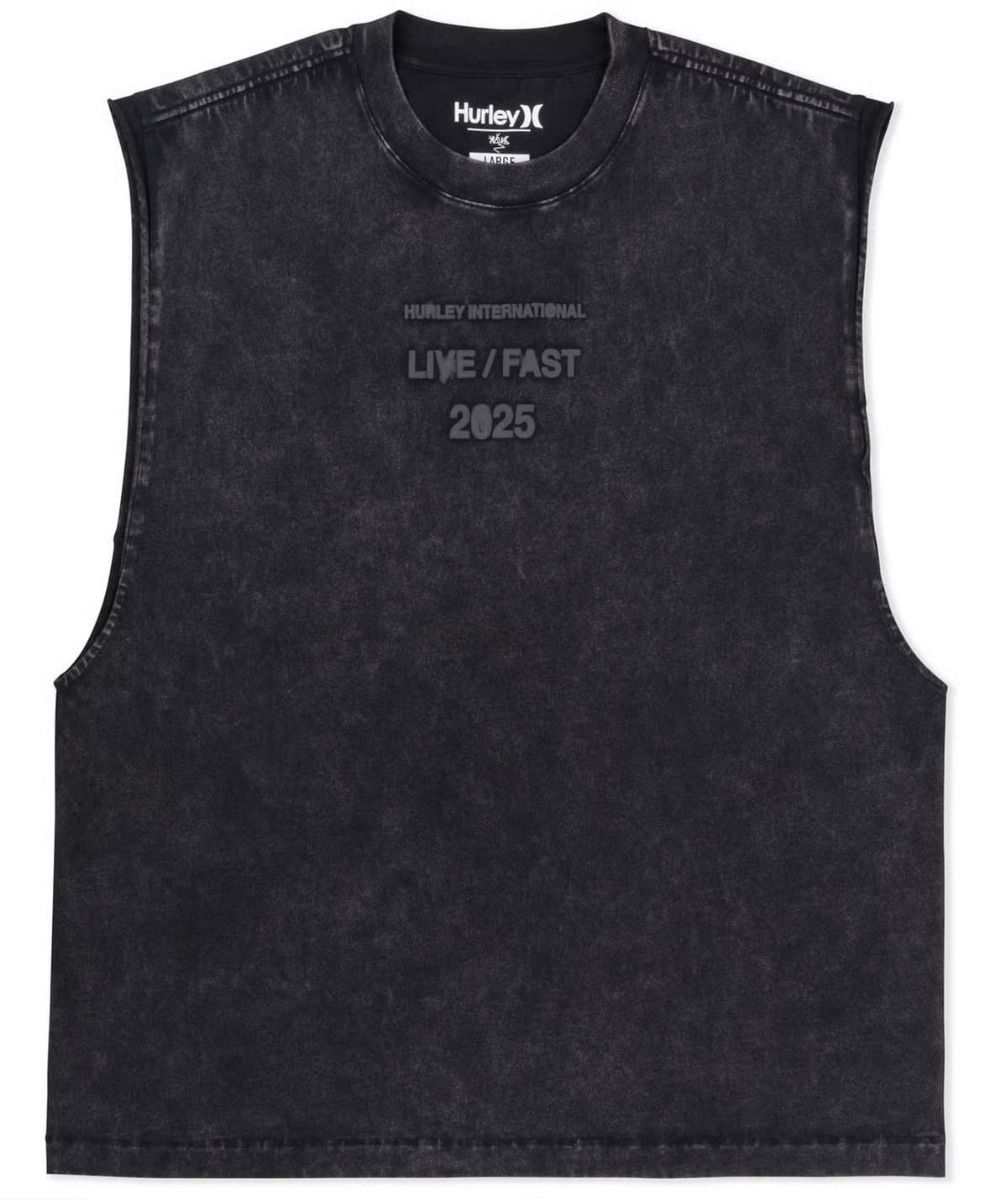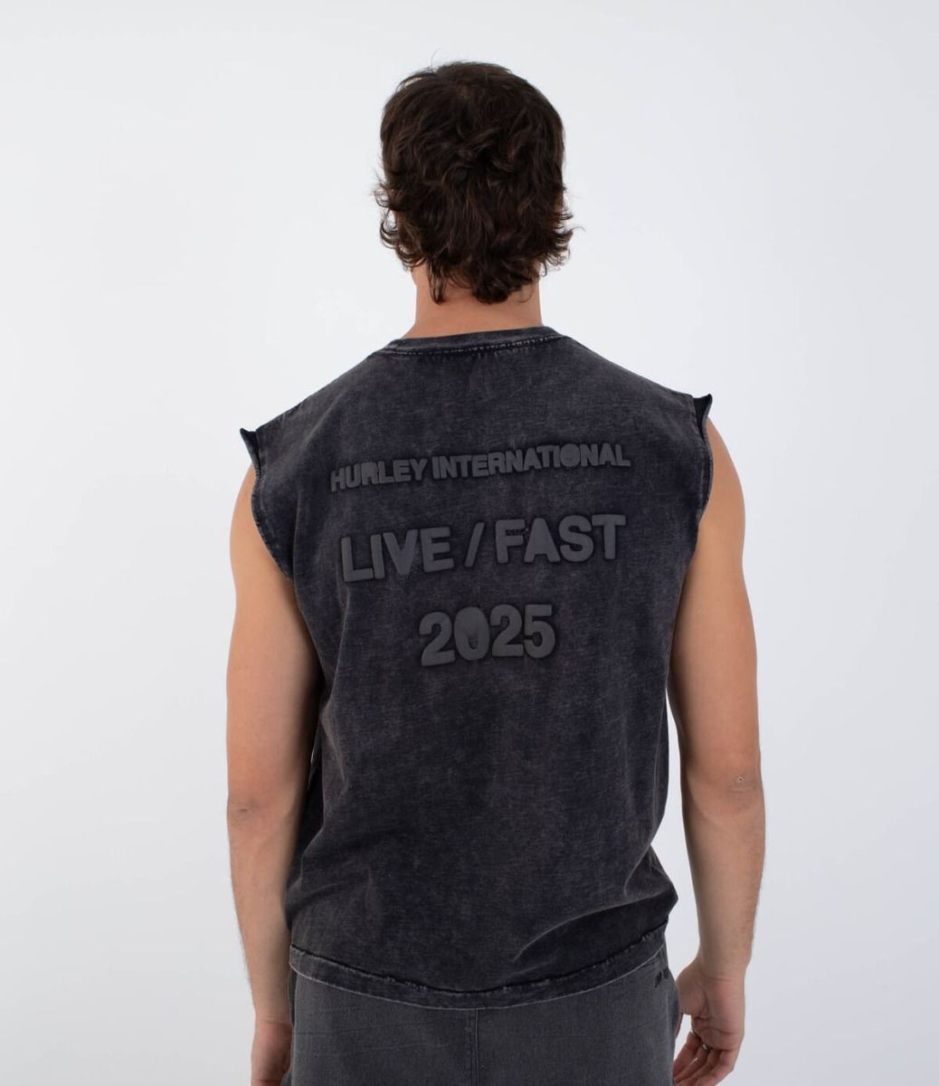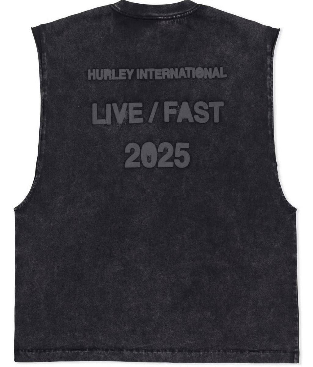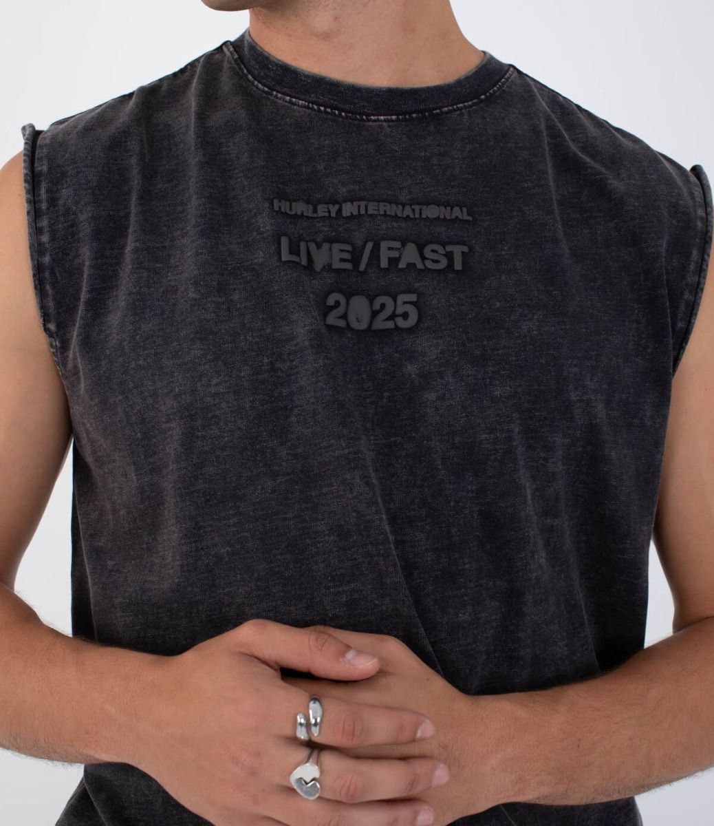 La camiseta sin mangas Live Fast Muscle Tee en negro (Black) forma parte de la colaboración más intensa entre Hurley y Travis Barker. Su diseño proyecta esa vibra cruda y auténtica que conecta el punk con el surf más urbano. El negro desgastado del tejido revela matices únicos gracias al teñido en prenda, mientras que el gráfico en relieve "LIVE / FAST 2025" lo dice todo sin necesidad de gritar.