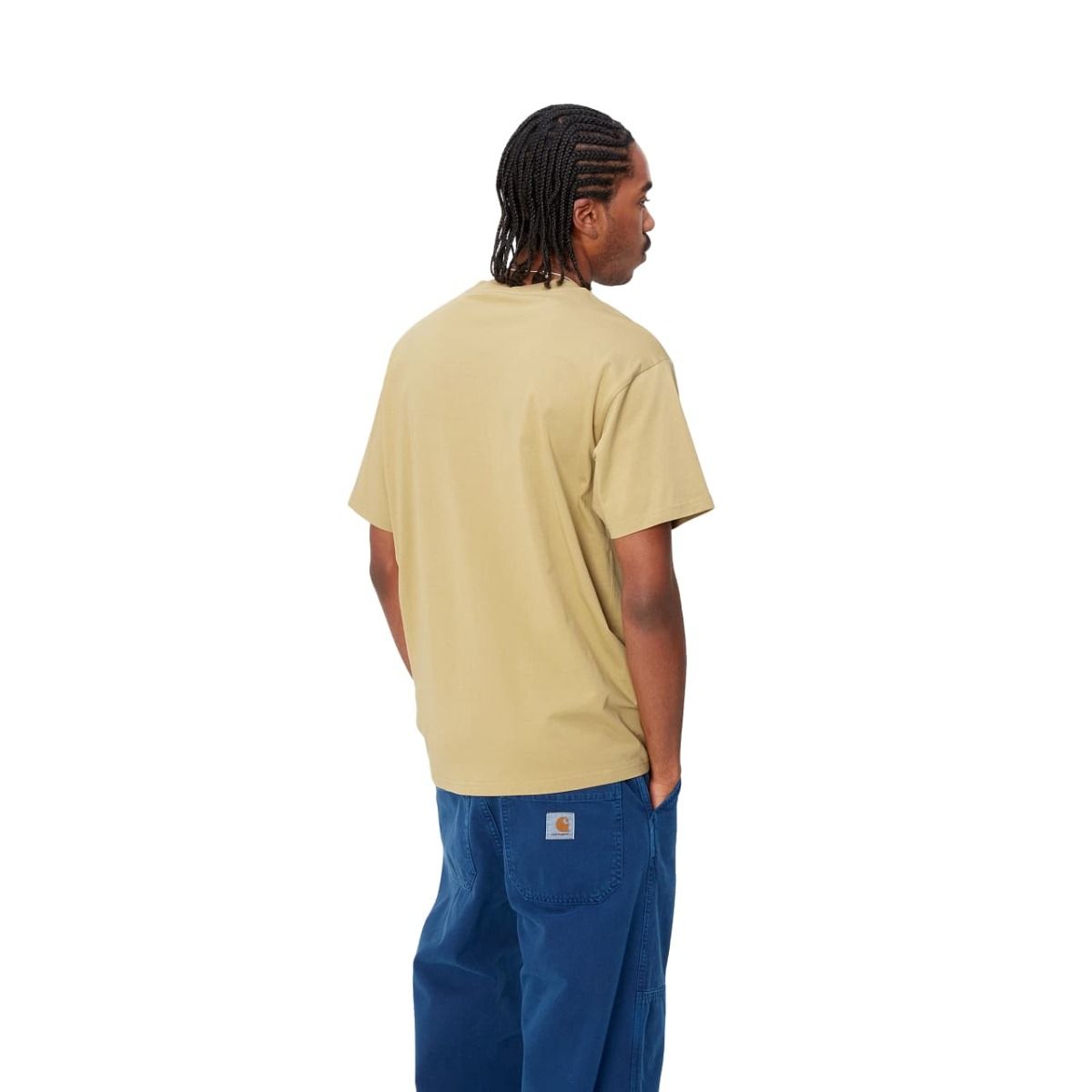 Esta camiseta básica beige de corte holgado cuenta con cuello redondo, manga corta y el logo de Carhartt WIP en texto bordado en color blanco en el lado izquierdo del pecho.