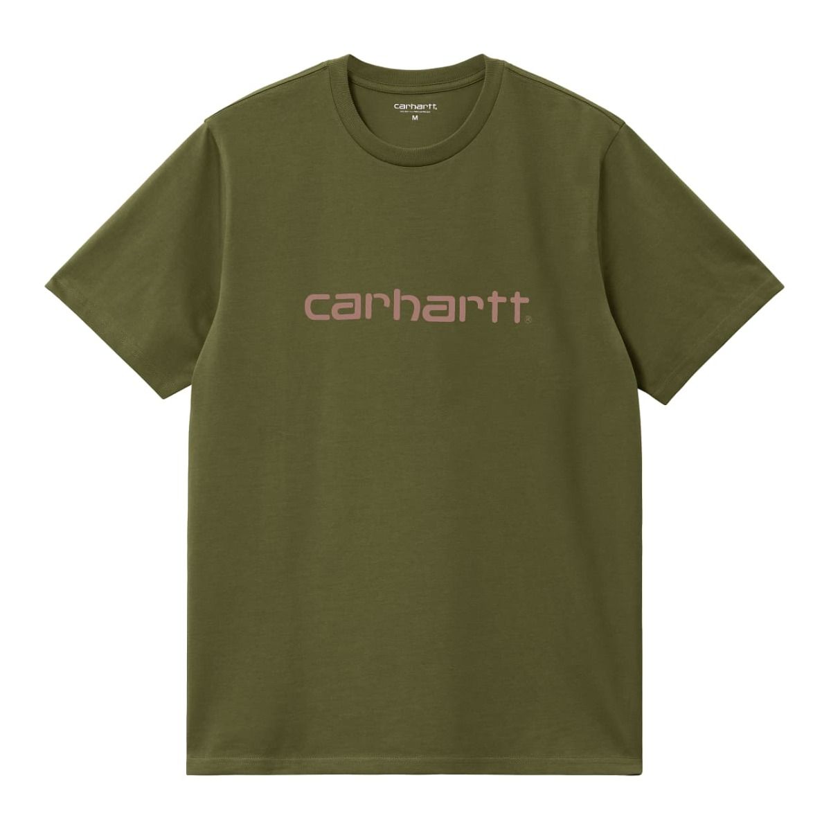 Esta camiseta clásica verde de ajuste regular para hombre cuenta con cuello redondo, manga corta y el logo en texto de Carhartt impreso en color rosa en la parte delantera.