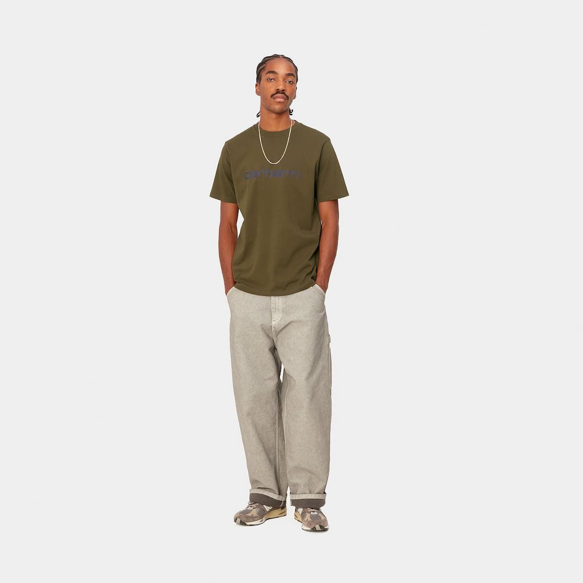 Esta camiseta clásica de ajuste regular para hombre cuenta con cuello redondo, manga corta y el logo en texto de Carhartt estampado en tono morado en la parte delantera.