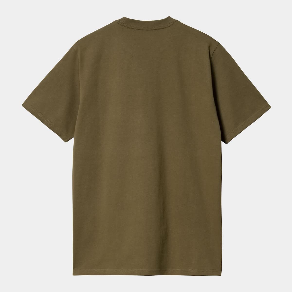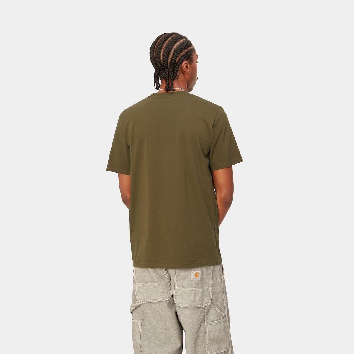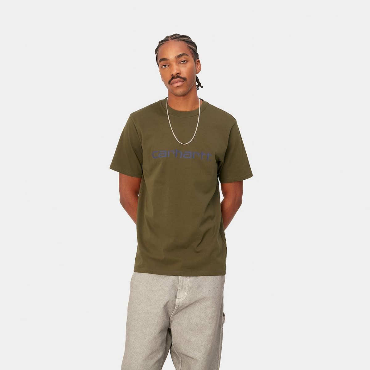 La camiseta de manga corta para hombre S/S Script T-Shirt en verde con el logo en morado (Highland/Cassis) de Carhartt WIP está confeccionada con tejido punto jersey de algodón sencillo (190g/sqm).