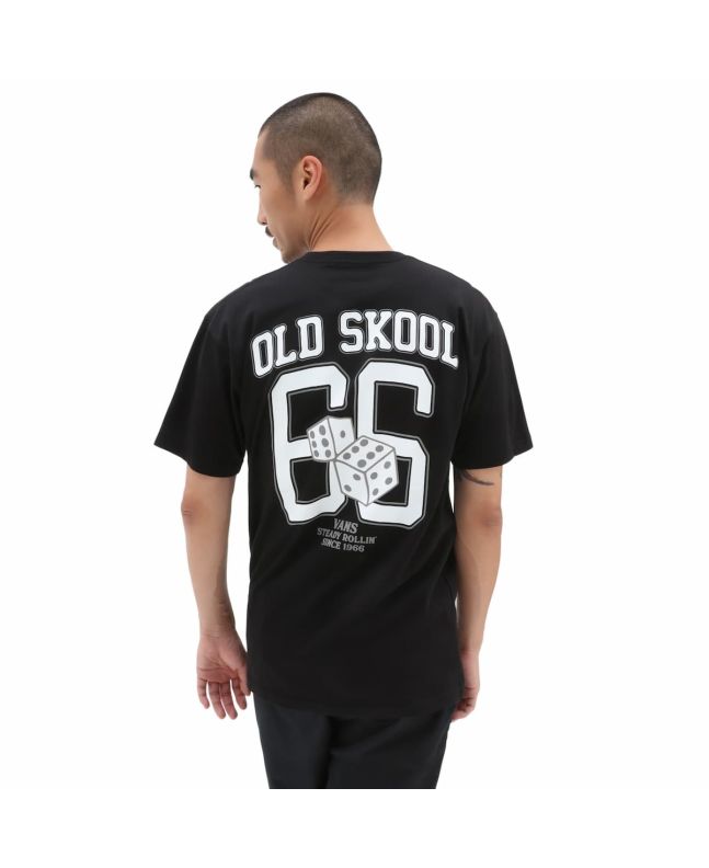 Esta camiseta de corte clásico cuenta con cuello redondo, manga corta y el logo Vans junto con unos dados y la inscripción "Old Skool 66. Vans. Steady Rollin' Since 1966" estampados en el lado izquierdo del pecho y en la espalda.