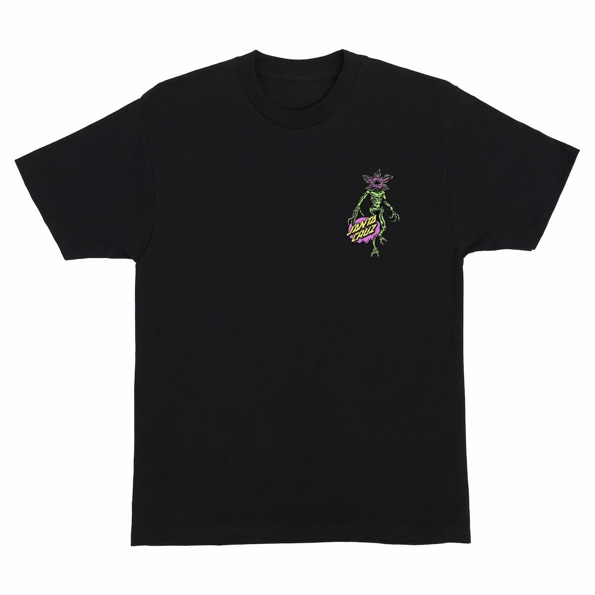 En el pecho luce un pequeño logotipo Demogorgon Dot, mientras que la espalda sorprende con un gran gráfico multicolor con el demogorgon y los logos Santa Cruz y Stranger Things, impresos con tinta suave al tacto para un acabado premium.