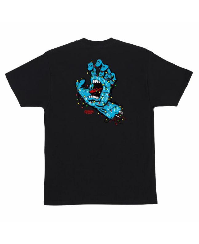 Presenta un corte regular y combina un logotipo pequeño Santa Cruz en el pecho con un gráfico trasero multicolor Screaming Lights que brilla en la oscuridad, inspirado en la icónica pared de luces navideñas de la serie.