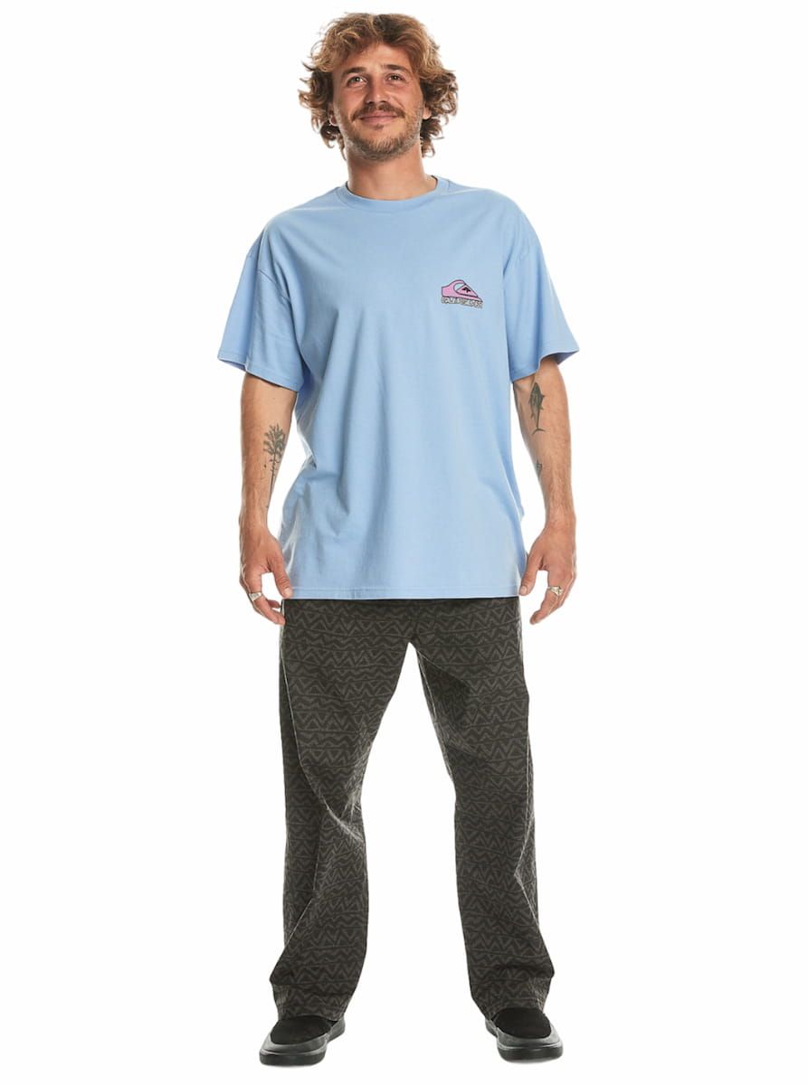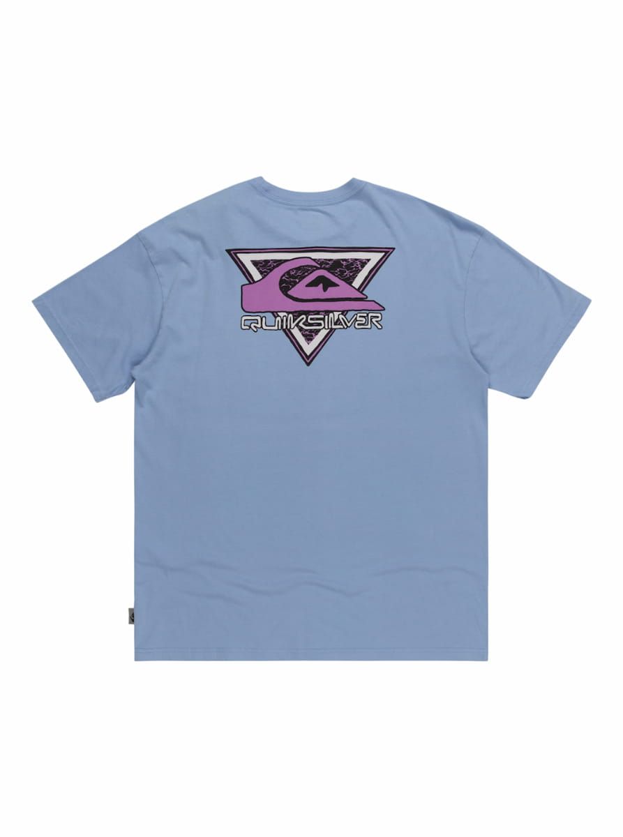 Esta camiseta azulada orgánica de corte oversize, perteneciente a la Colección Heat Wave, viene con cuello redondo de punto acanalado, manga corta, tejido lavado para un look vintage, serigrafiado Quiksilver de temporada impreso en morado en el lado izquierdo del pecho y en la espalda, junto con una pequeña etiqueta de la marca tejida en la costura lateral.