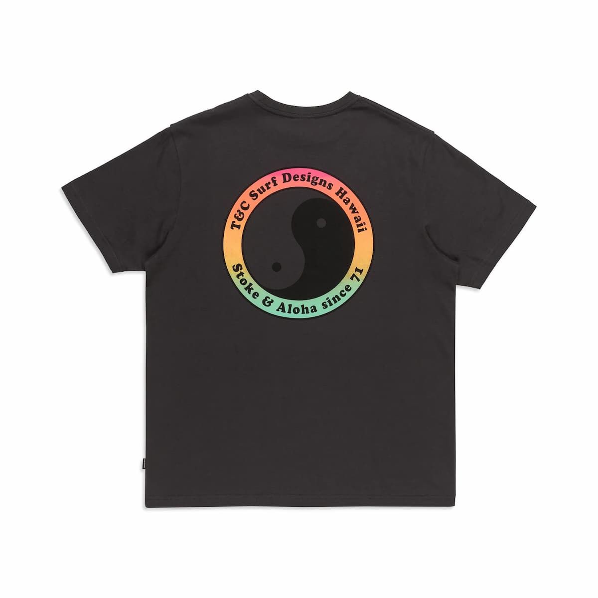 Esta camiseta surfera eco-friendly negra de corte clásico presenta el místico logo del Yin Yang de Town and Country impreso en el lado izquierdo del pecho y en la espalda con la inscripción "T&C Surf Designs Hawaii - Stoke & Aloha Since 71", cuello redondo de 15mm, manga corta y una etiqueta T&C tejida en la costura lateral.