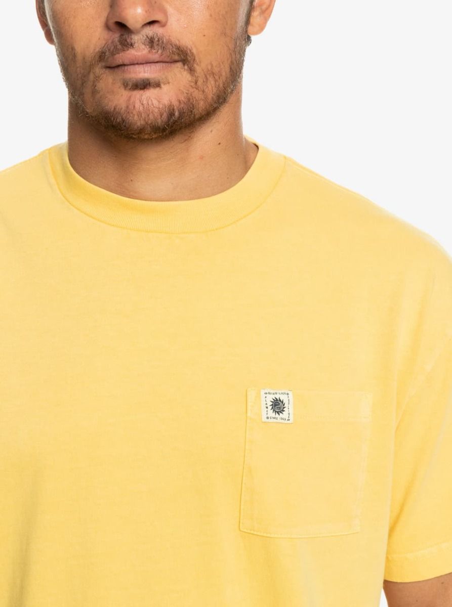 La camiseta de manga corta The Natural Dye amarilla para hombre tiene el sello de garantía Quiksilver.
